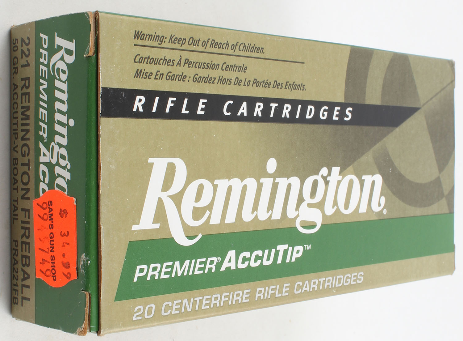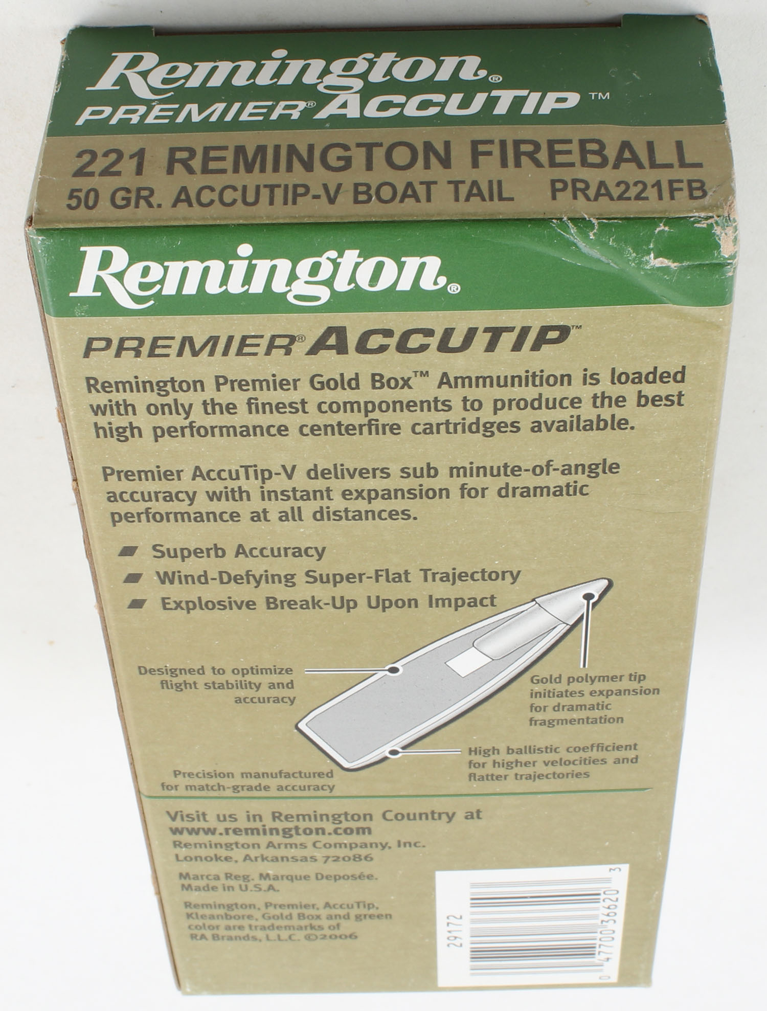 Remington, Premier AccuTip, .221 Remington Fireball, 50 Grain AccuTip-V Boat Tail, Full, 1pc, Gold, green, white & black box, box is very solid, ammo is excellent. Grade: Excellent ++ - Value: 20 to 50