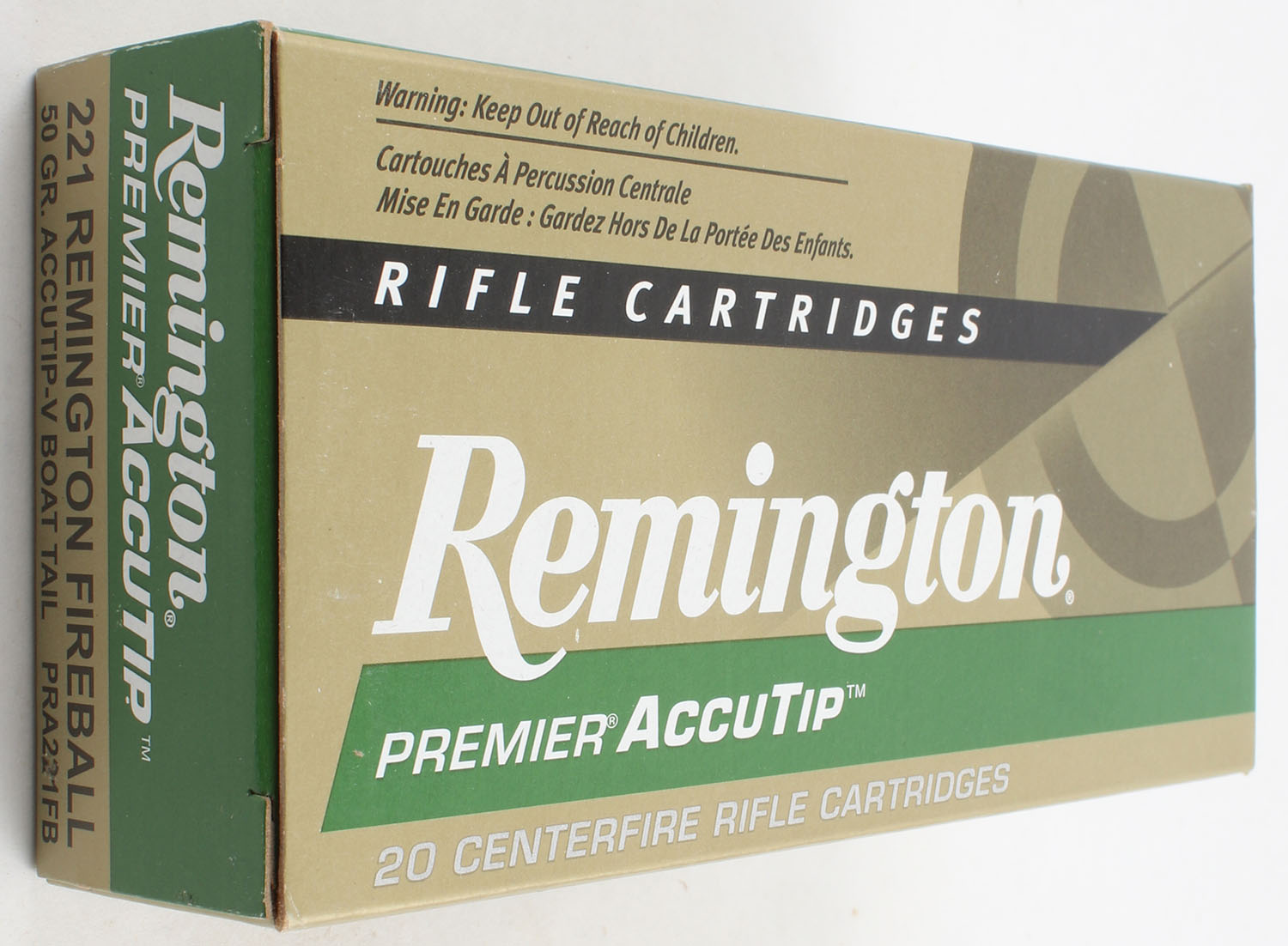 Remington, Premier AccuTip, .221 Remington Fireball, 50 Grain AccuTip-V Boat Tail, Full, 1pc, Gold, green, white & black box, box is very solid, ammo is excellent. Grade: Excellent ++ - Value: 20 to 50