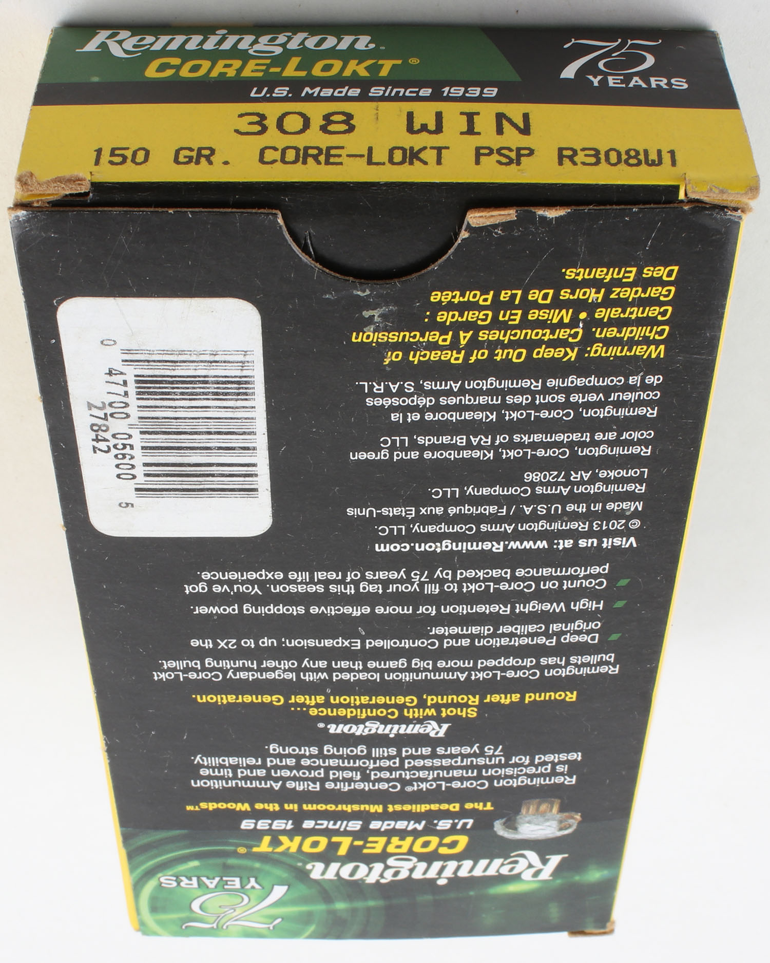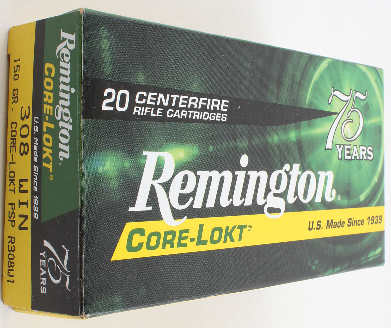 Remington, Core-Lokt, .308 Winchester, 150 Grain Core Lokt PSP, Full, 1pc. Multi-colored box, box is very solid with excellent color, ammo is excellent. Grade: Excellent + - Value: 20 to 40