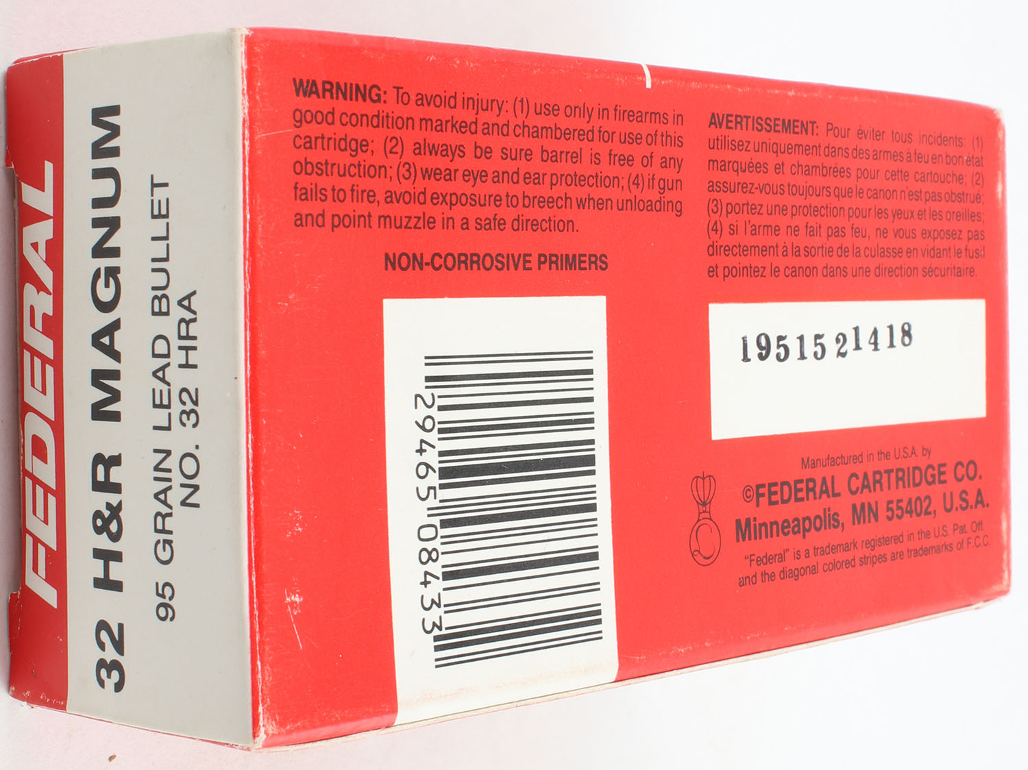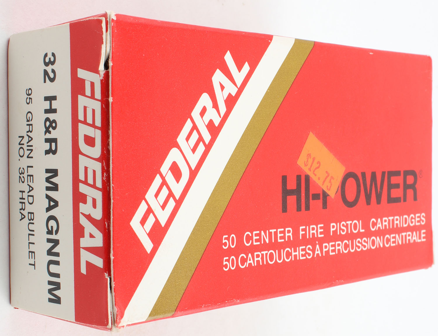 Federal, Hi-Power, .32 H&R Magnum, 95 Grain Lead Bullet, Full, 1pc. Multi-colored box, box is very solid with excellent color, ammo is very good. Grade: Excellent ++ - Value: 40 to 60