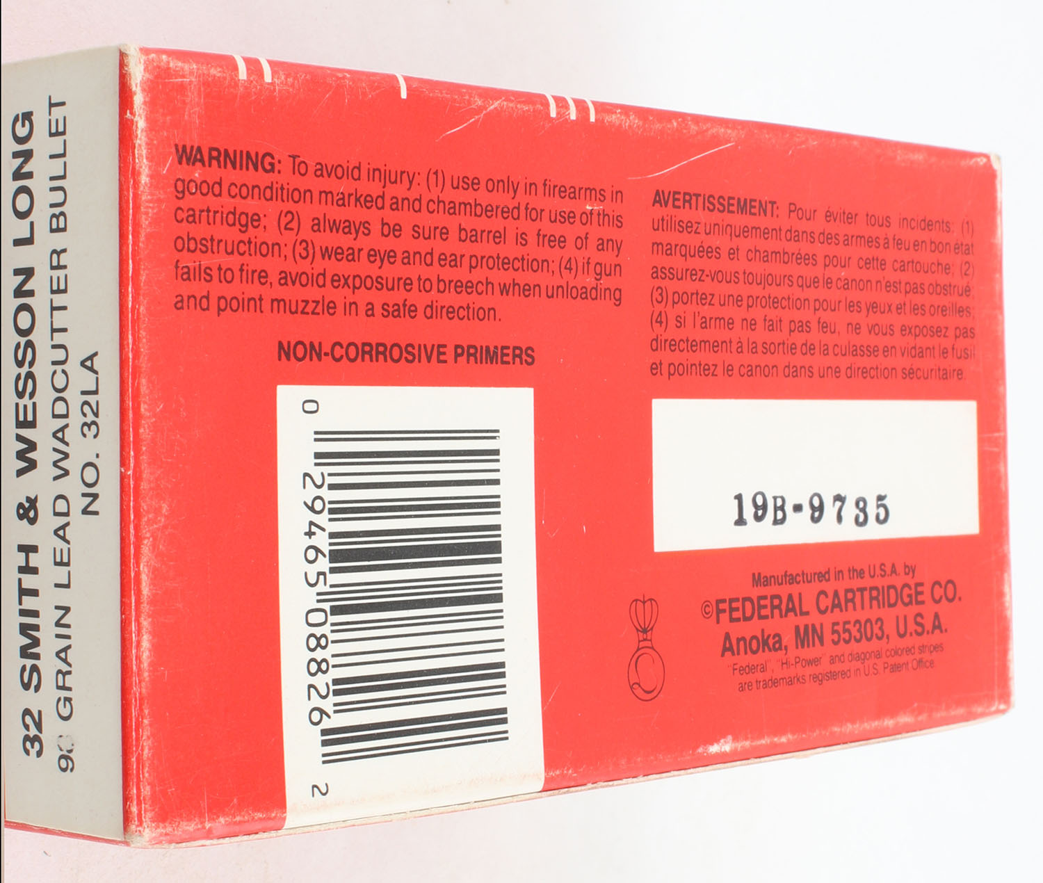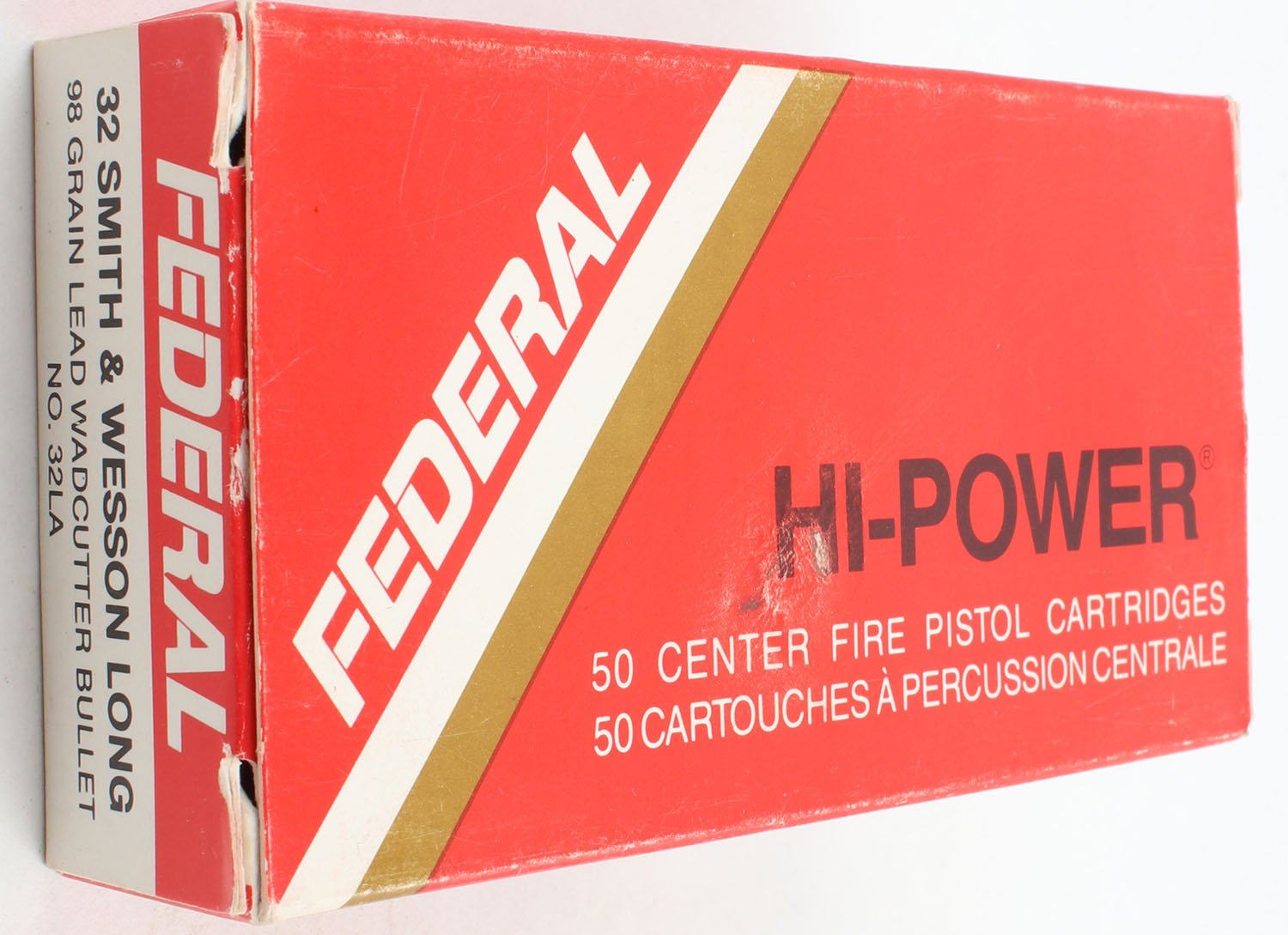 Federal, Hi-Power, .32 Smith & Wesson Long, 98 Grain Lead Wadcutter Bullet, Full, 1pc. Multi-colored box, box is very solid with excellent color, ammo is very good. Grade: Excellent + - Value: 20 to 40