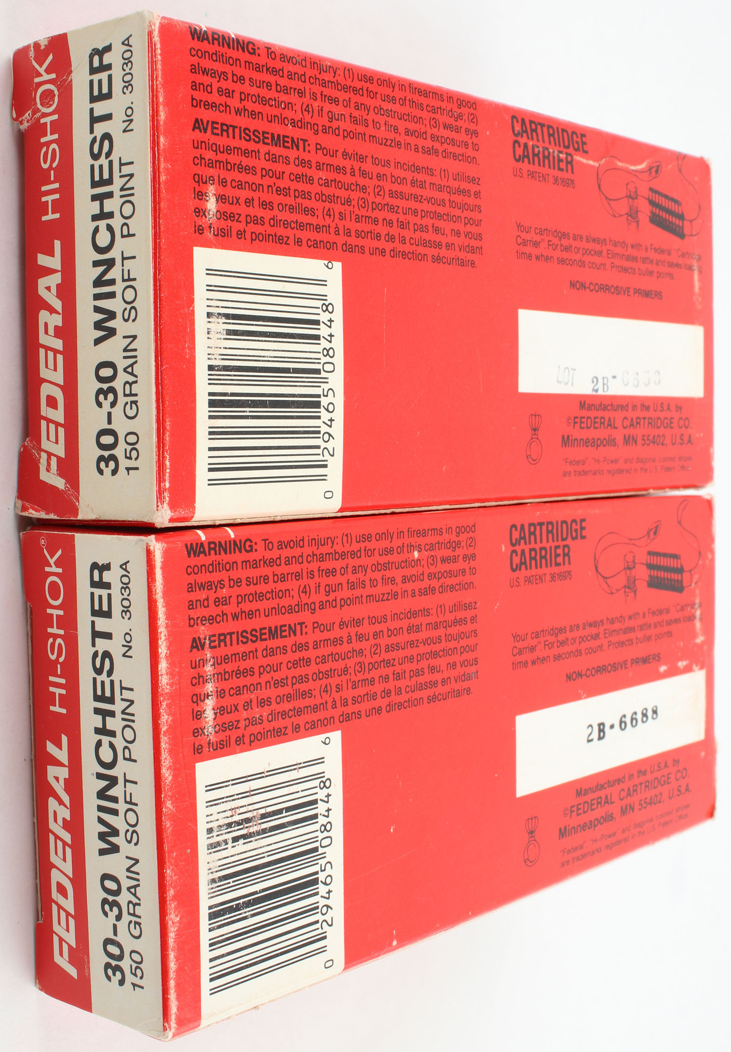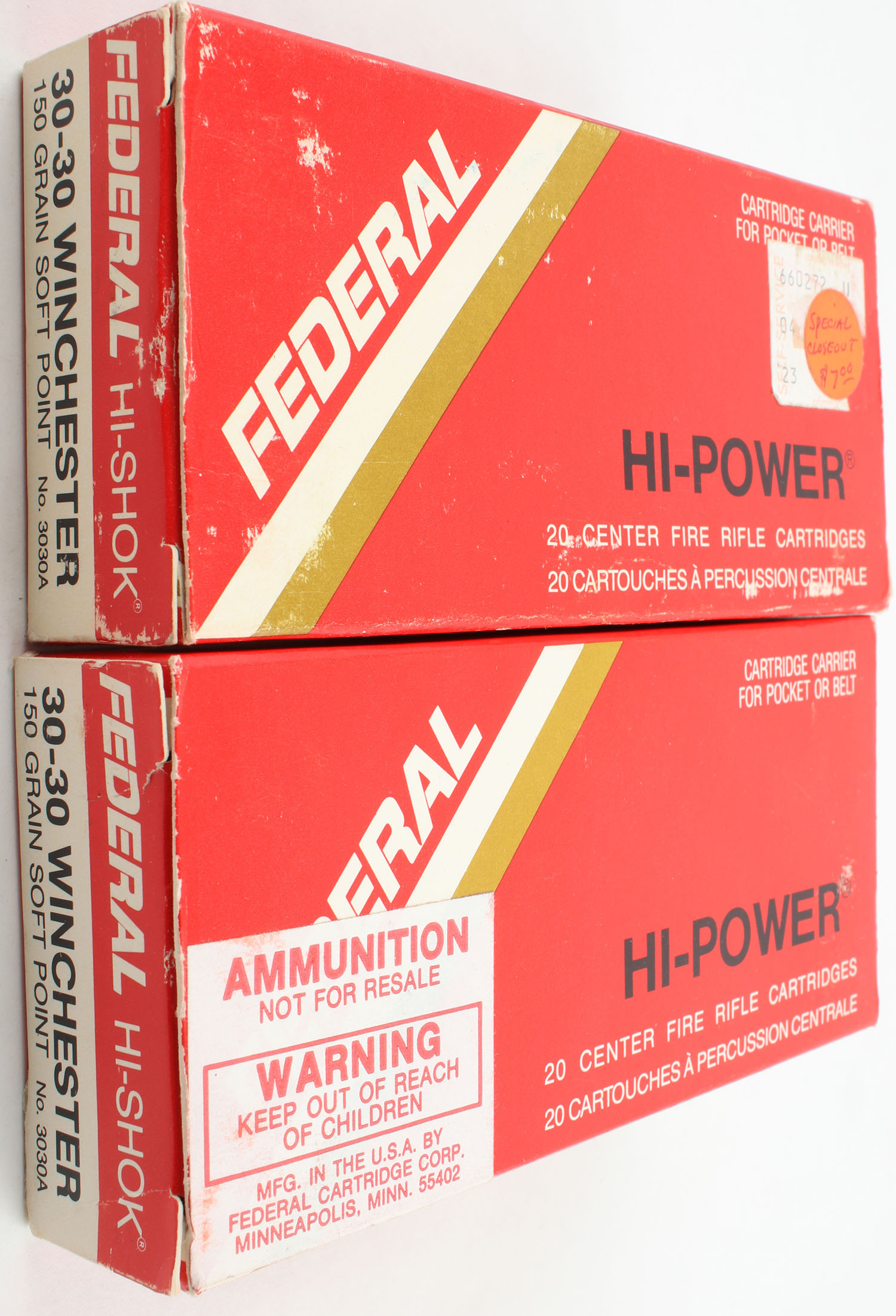 Federal, Lot of (2), Hi-Power, .30-30 Winchester, 150 Grain Soft Point, Full, 1pc. Multi-colored boxes, boxes are solid with very good color, ammo is excellent. Grade: Excellent - Value: 30 to 60