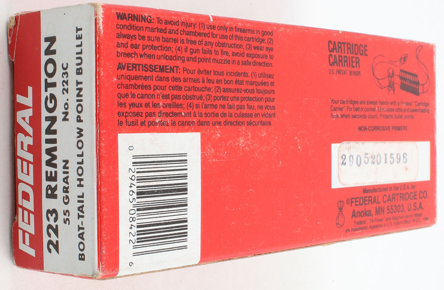 Federal, Hi-Power, .223 Remington, 55 Grain Boat Tail Hollow Point Bullet, Full, 1pc. Multi-colored box, box is very solid with very good color, ammo is excellent. Grade: Excellent + - Value: 10 to 40