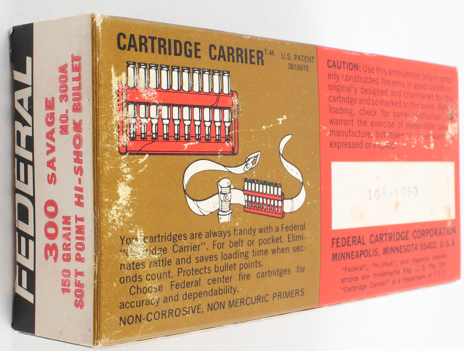Federal, Rifle Cartridges, .300 Savage, 150 Grain Soft Point Hi Shok, Full, 1pc. Multi-colored box, box is solid with very good color, has light shelf wear, ammo is excellent. Grade: Excellent - Value: 20 to 40
