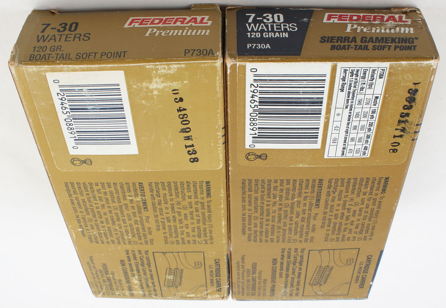 Federal, Lot of (2), Premium, 7-30 Waters, 120 Grain Boat Tail Soft Point, Full, 1pc. Multi-colored boxes, boxes are solid with light scuffing, ammo is excellent. Grade: Excellent - Value: 40 to 80