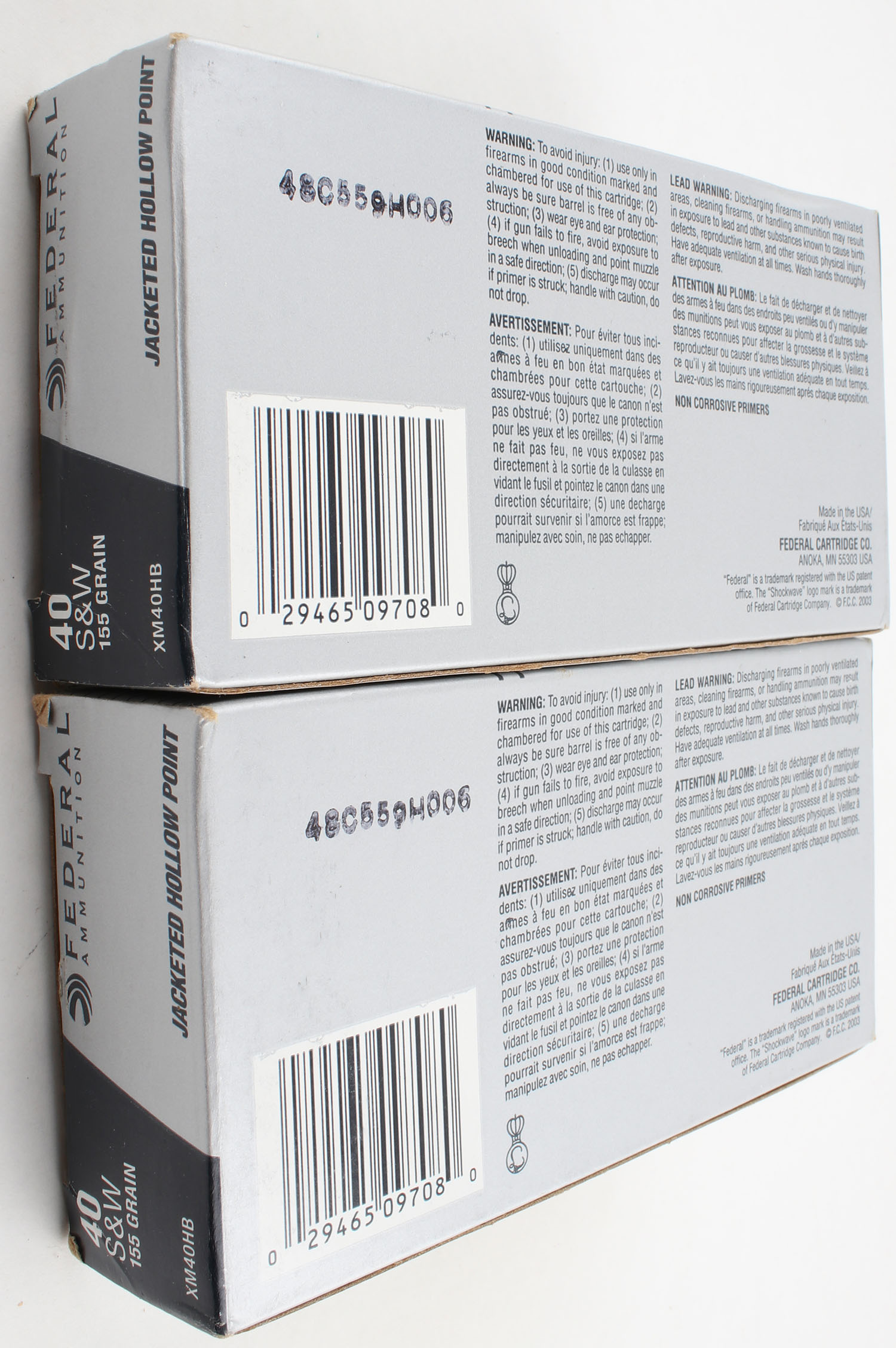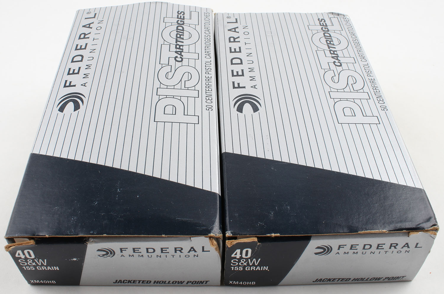 Federal, Lot of (2), .40 Smith & Wesson, 155 Grain JHP, Full, 1pc. Grey & blue boxes, boxes are very solid with excellent color, have very minor shelf wear, end flaps are solid, ammo is excellent. Grade: Excellent + - Value: 30 to 60
