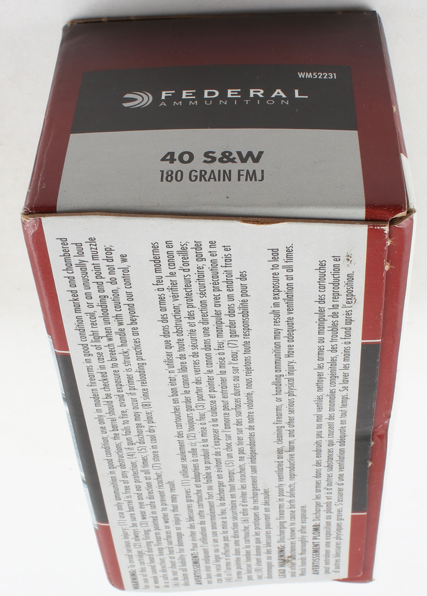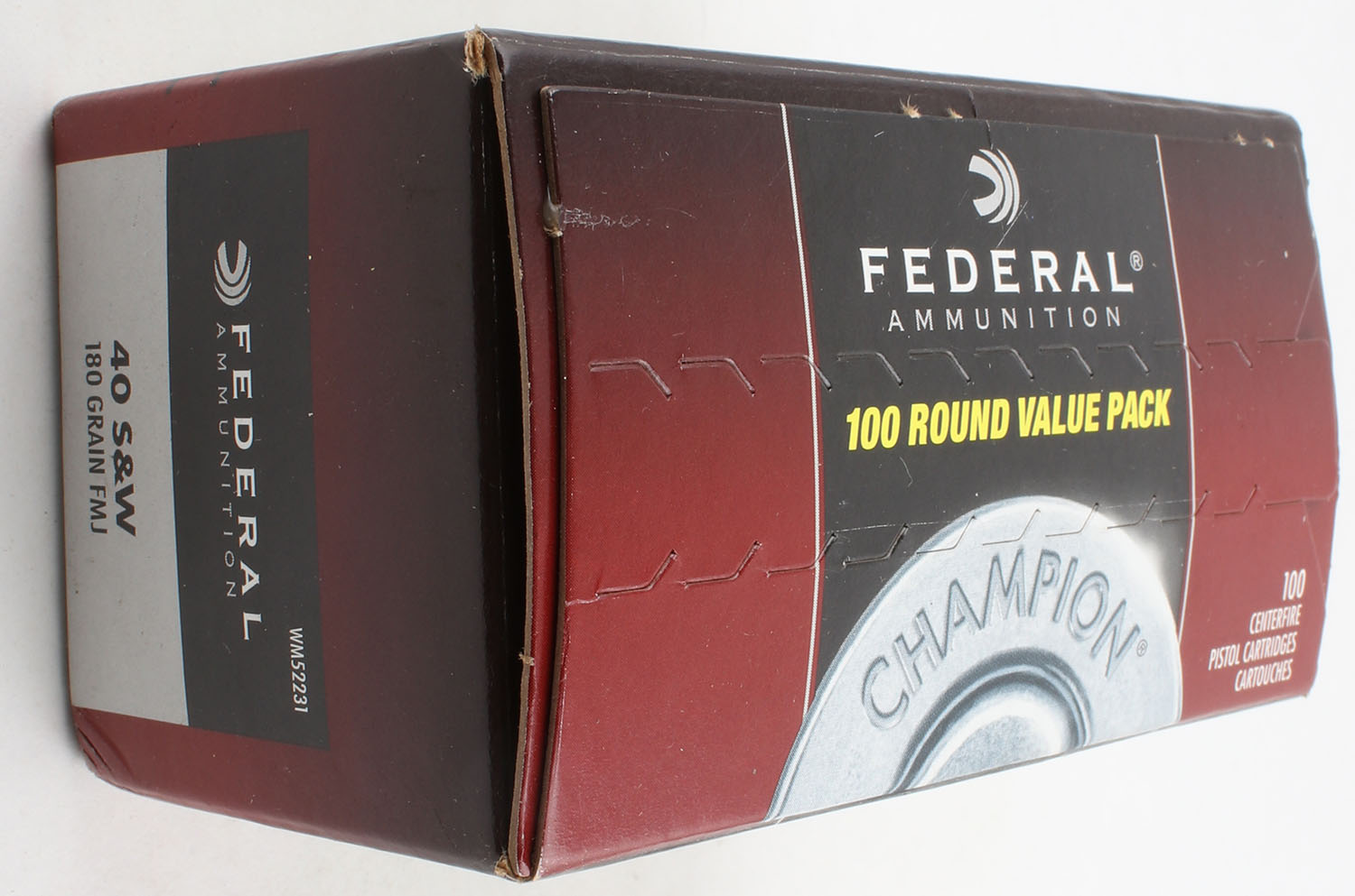 Federal, Champion, .40 Smith & Wesson, 180 Grain FMJ, Full & Sealed, 1pc. Multi-colored box, box is very solid with excellent color. Grade: MINT - Value: 20 to 60