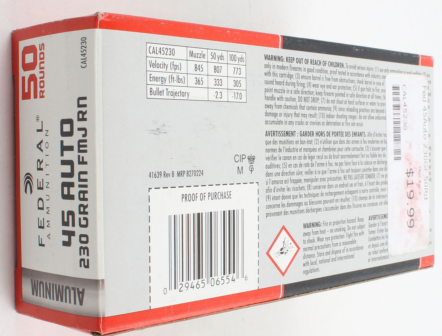 Federal, Champion, .45 Auto., 230 Grain FMJ RN Aluminum Case, Full, 1pc. Multi-colored box, box is very solid with excellent color, end flaps are solid, ammo is minty. Grade: MINT - Value: 20 to 40