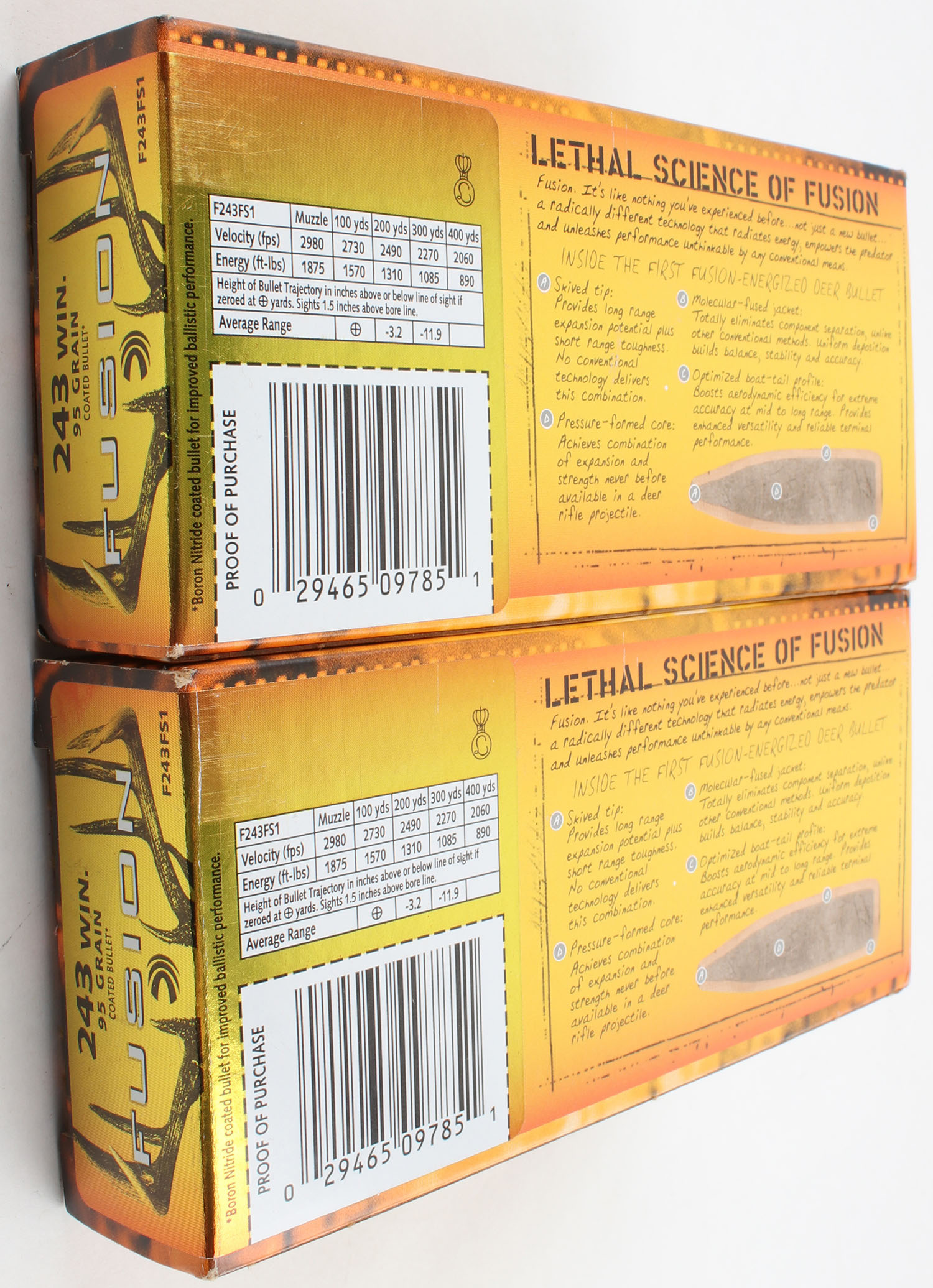Federal, Lot of (2), Fusion, .243 Winchester, 95 Grain, Full, 1pc. Multi-colored boxes, boxes are very solid with excellent color, end flaps are solid, ammo is minty. Grade: Excellent + - Value: 40 to 80