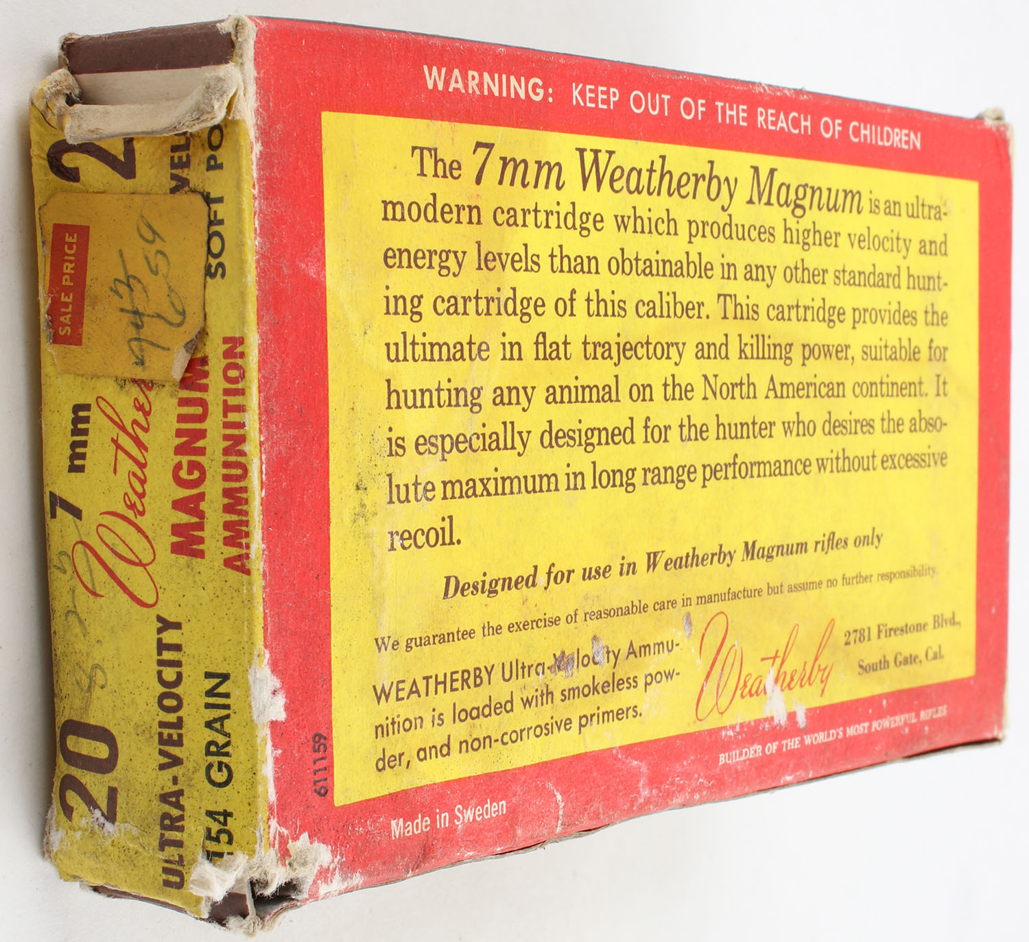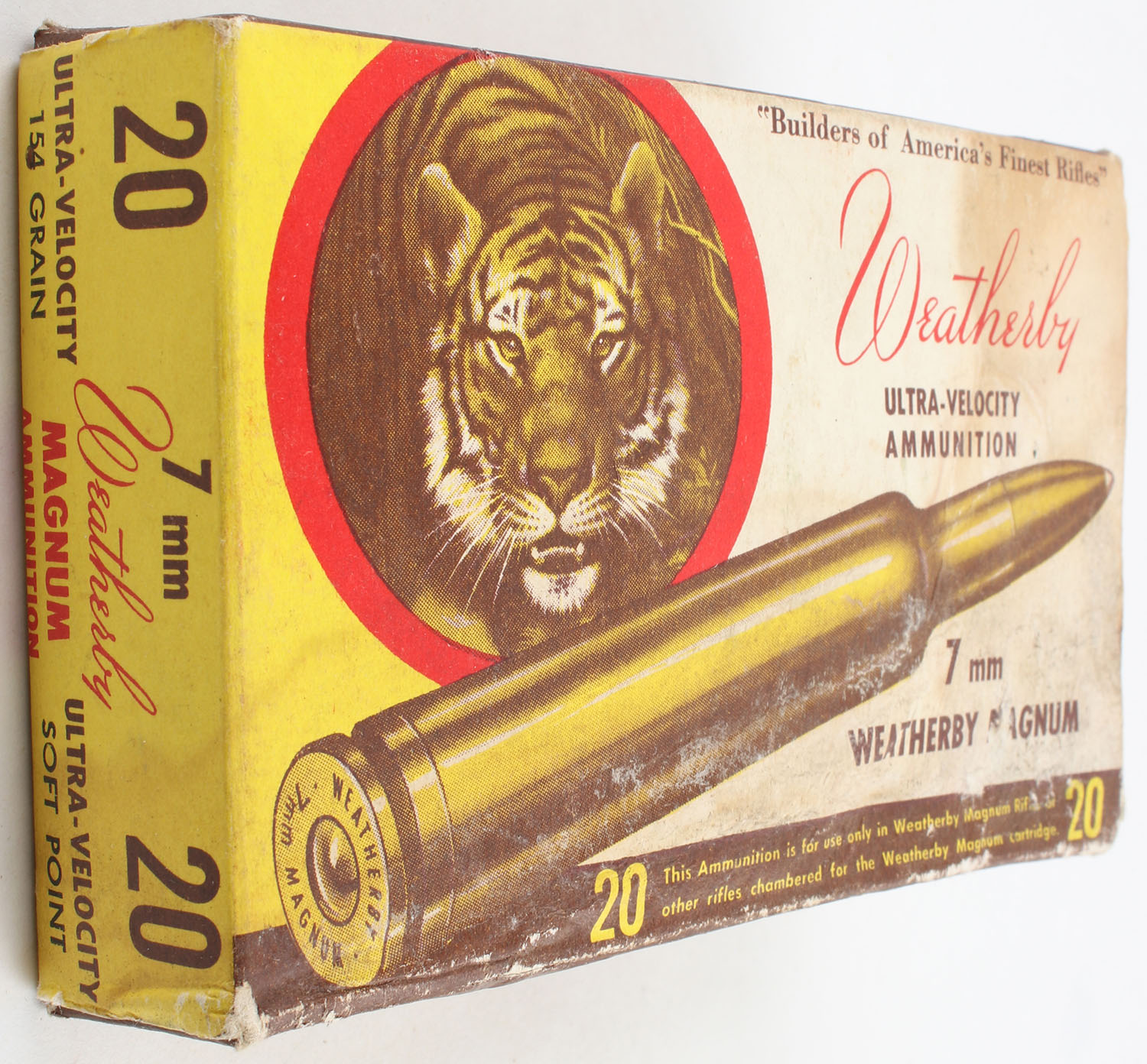 Weatherby, Ultra Velocity, 7mm Weatherby Magnum, 154 Grain Soft Point, Full, 1pc. Multi-colored box, box has age soiling, scuffing, edge & corner wear, end flaps are solid, ammo is good to very good. Grade: Good ++ - Value: 20 to 80