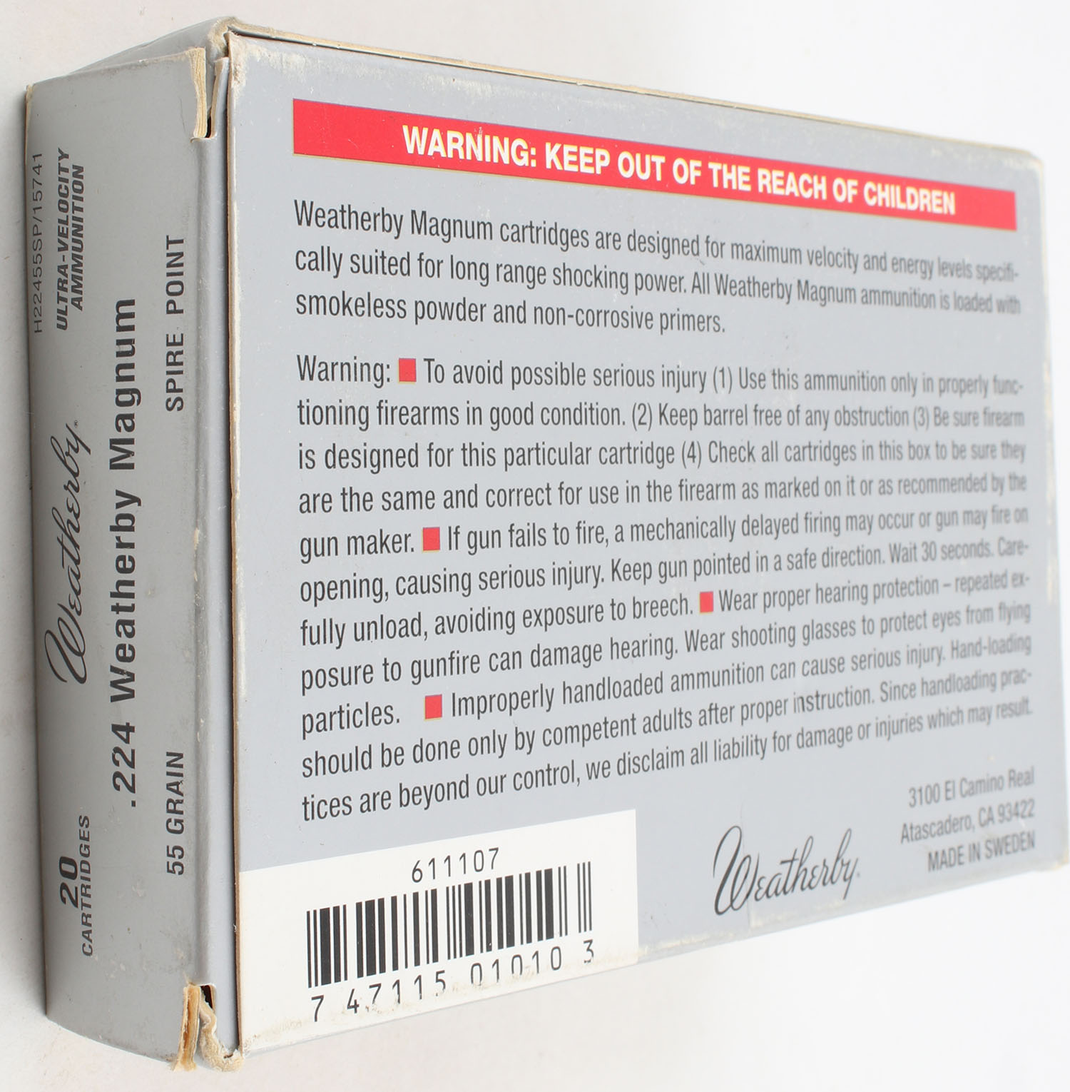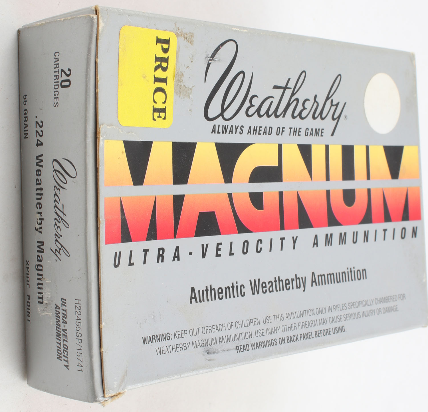 Weatherby, Ultra Velocity, .224 Weatherby Magnum, 55 Grain Spire Point, Full, 1pc. Multi-colored box, box has light corner wear & scuffing, end flaps are solid, ammo is minty. Grade: Excellent - Value: 20 to 60