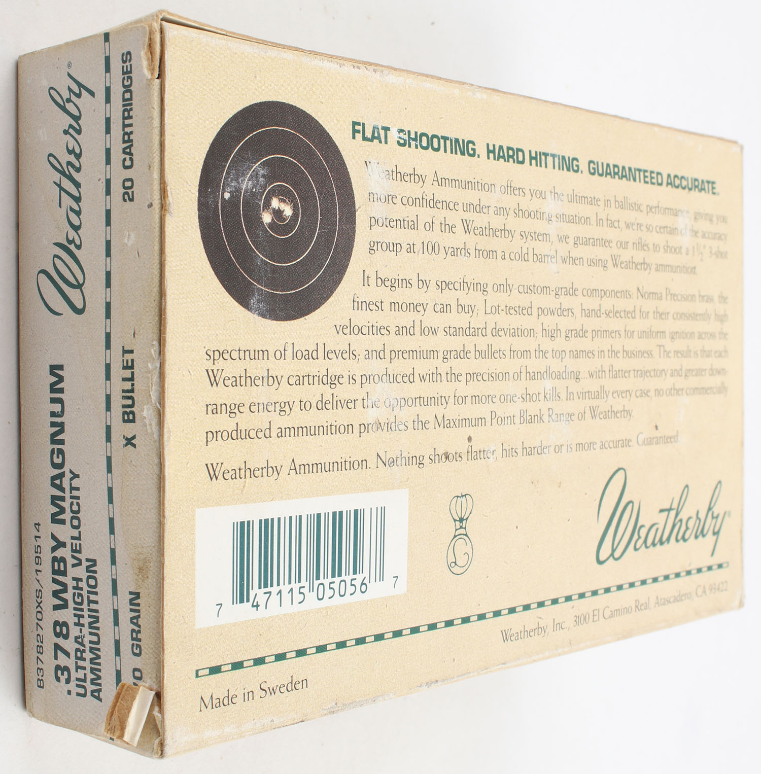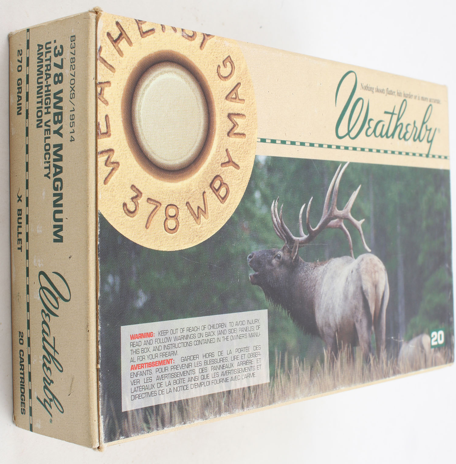 Weatherby, Ultra High Velocity, .375 Weatherby Magnum, 270 Grain X Bullet, Full, 1pc. Multi-colored box, box is very solid with excellent color, end flaps are solid, ammo is excellent. Grade: Excellent - Value: 50 to 150