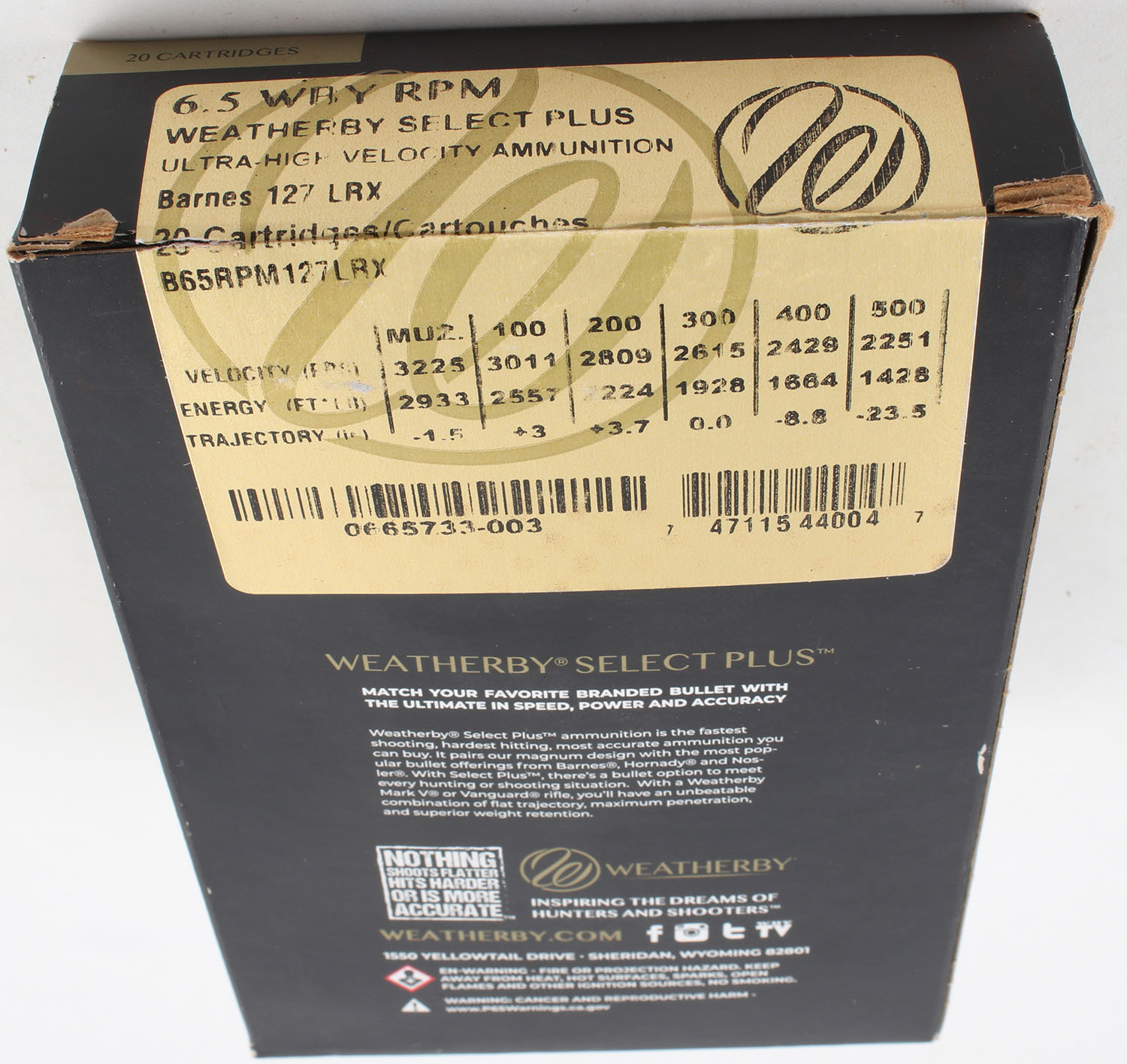 Weatherby, Select Plus, Ultra-High Velocity, 6.5 WBY RPM, Barnes 127 LRX, Full & SEALED, 1pc. Multi-colored box, box is solid with excellent color. Grade: Excellent ++ - Value: 40 to 80
