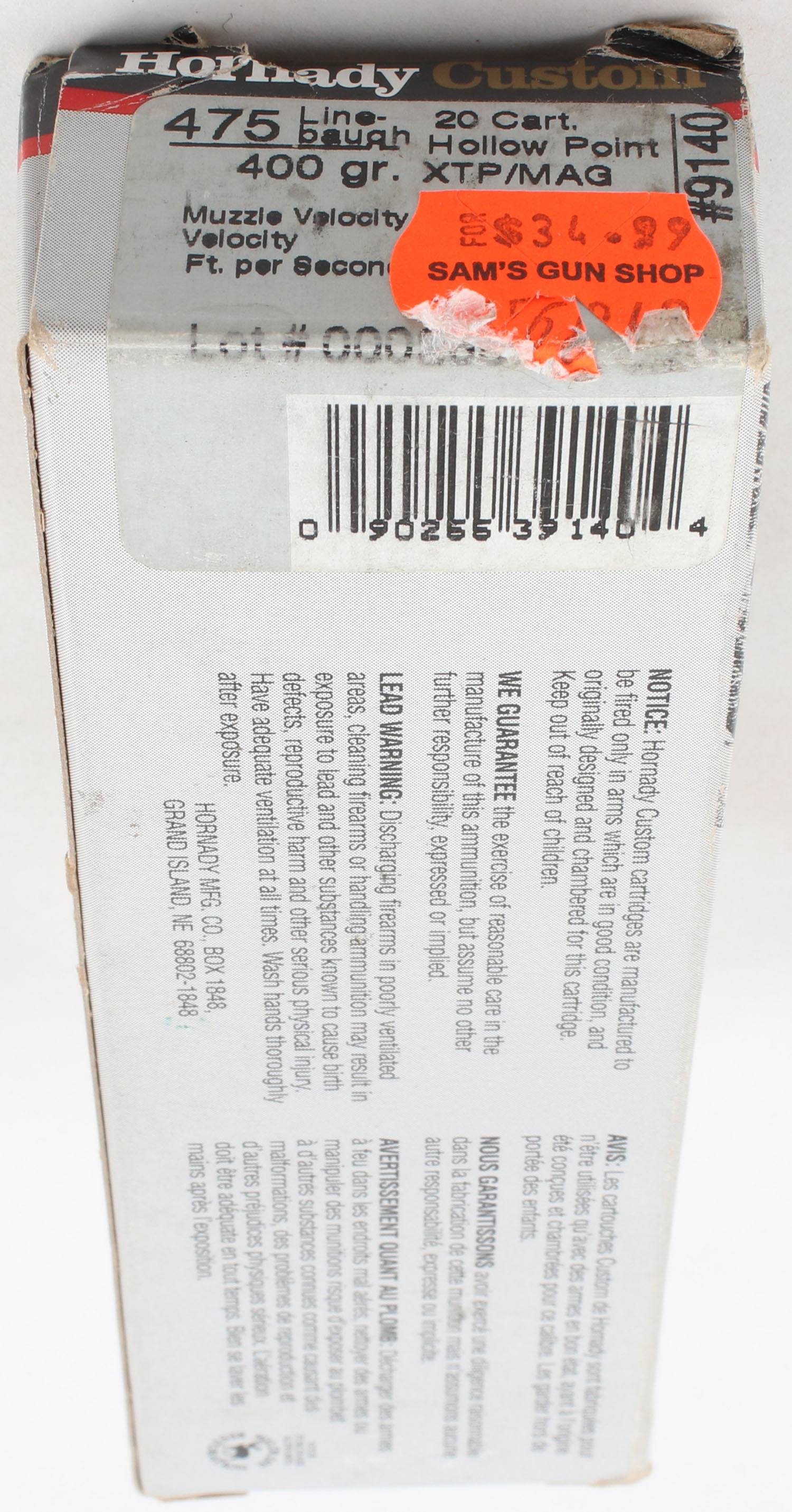 Hornady, Custom, .475 Linebaugh, 400 Grain HP XTP/Mag, Full, 1pc. Gray black & red box, box is solid with excellent color, light corner wear, end flaps are solid, ammo is excellent. Grade: Excellent - Value: 20 to 60
