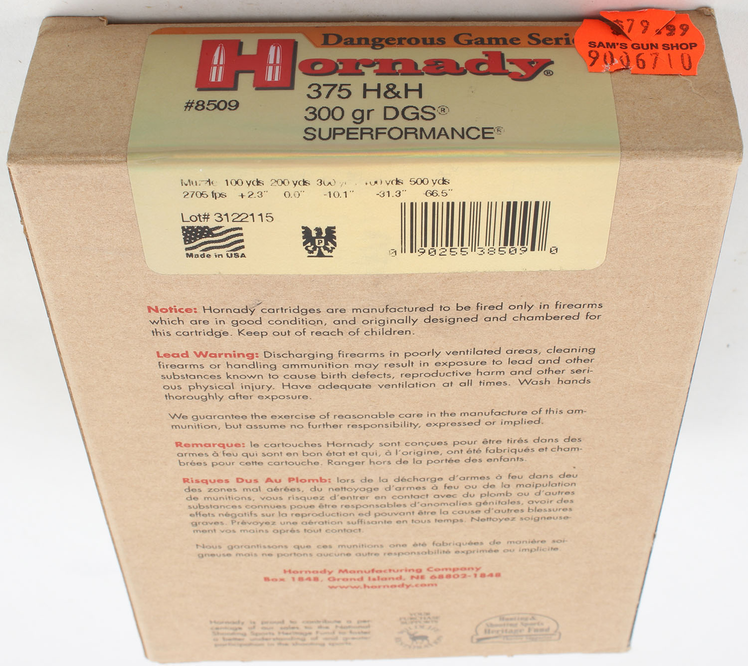 Hornady, Dangerous Game Series, .375 H&H, 300 Grain DGS, Full, 1pc. multi-colored box, box is solid with excellent color, Ammo is minty. Grade: Excellent ++ - Value: 40 to 80