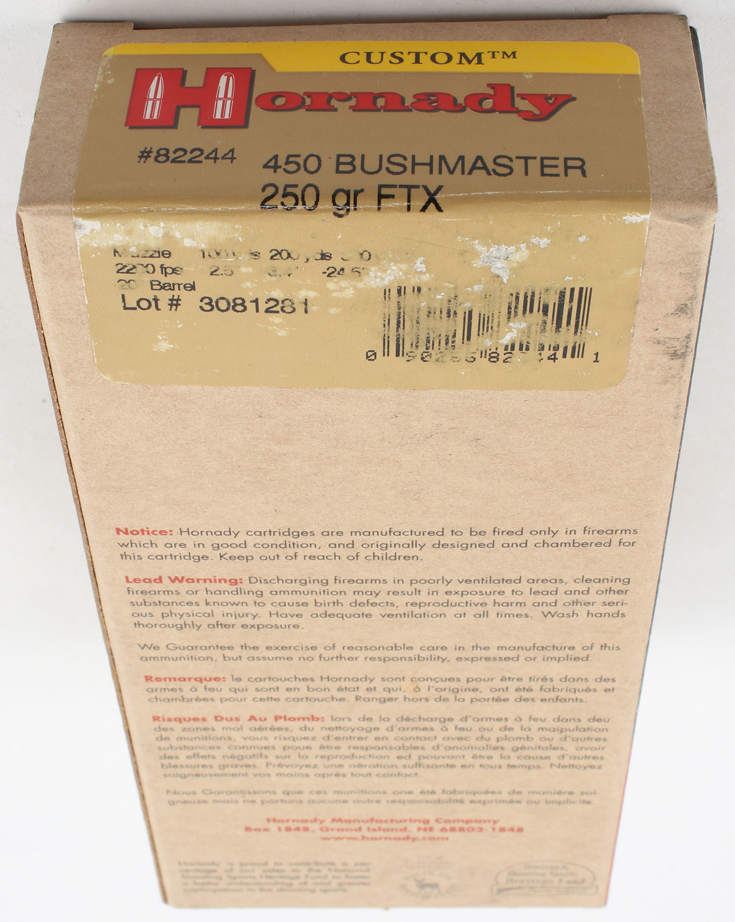Hornady, Custom, .450 Bushmaster, 250 Grain FTX, Full, 1pc., multi-colored box, box is very solid with excellent color, ammo is excellent. Grade: Excellent ++ - Value: 20 to 50