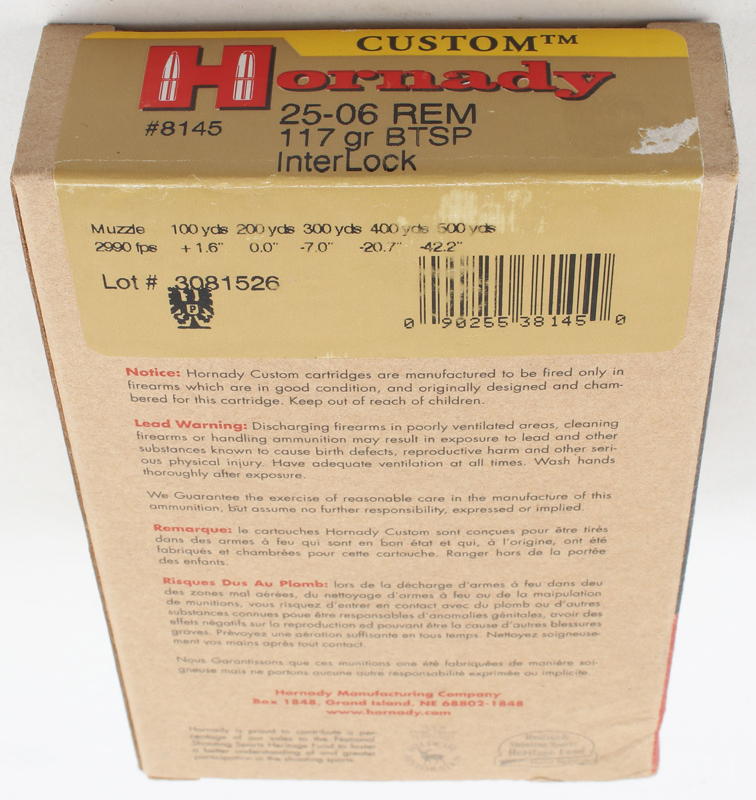 Hornady, Custom, .25-06 Remington, 117 Grain BTSP Interlock, Full of Frontier ammo H/S: Frontier 25-06 Rem, 1pc. Multi-colored box, box is solid with good color, end flaps are solid, ammo is excellent. Grade: Very Good - Value: 20 to 60