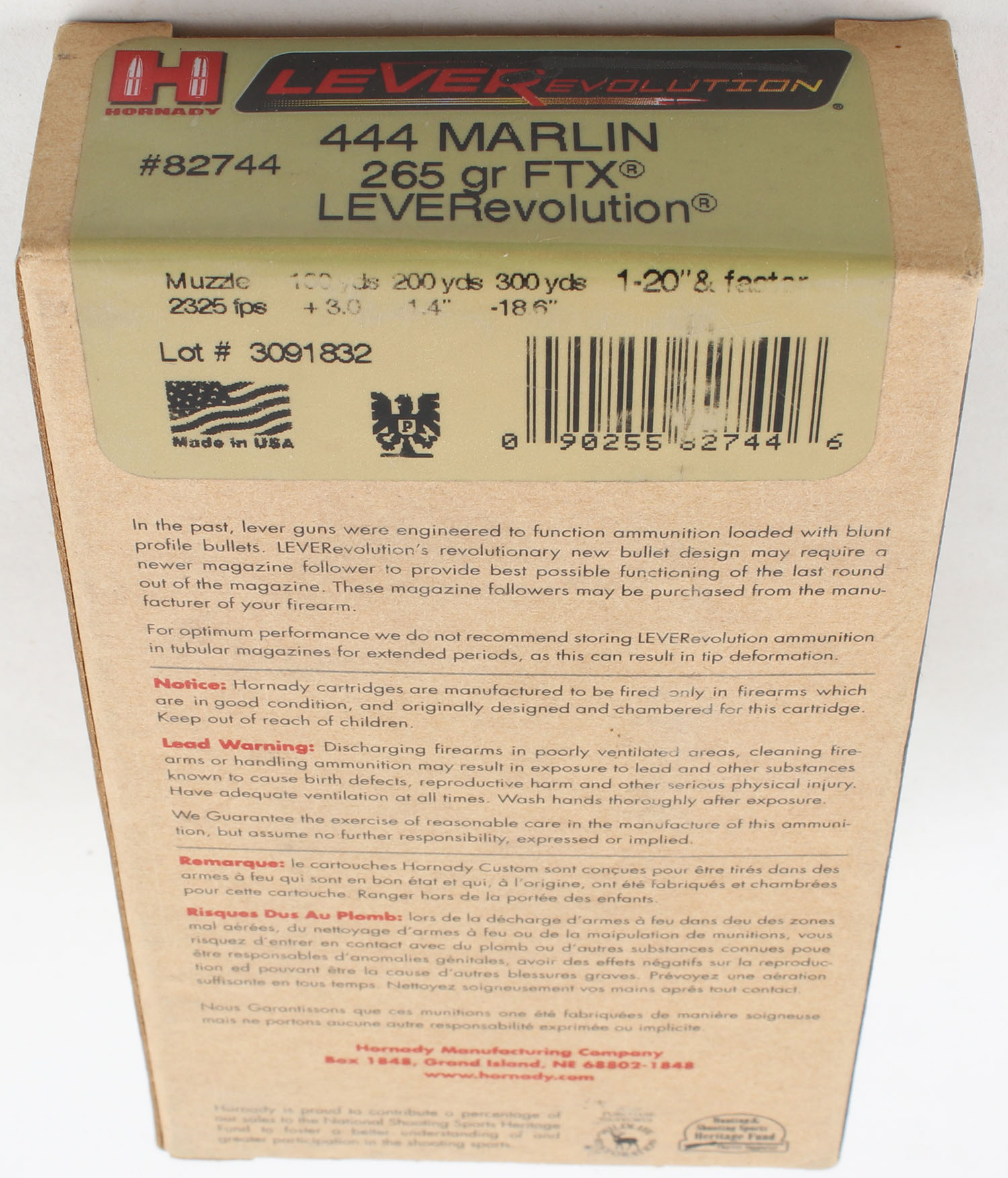 Hornady, LeverEvolution, .444 Marlin, 265 Grain FTX, Full, 1pc. multi-colored box, box is solid with excellent color, Ammo is excellent. Grade: Excellent ++ - Value: 40 to 80