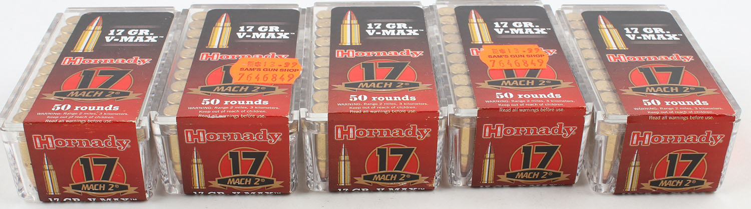 Hornady, Lot of (5), MACH 2, 17 Grain V-Max, FULL & SEALED, 50 rds each or 250 total rounds. 1pc. Multi-colored boxes, boxes are solid with excellent color, Ammo is excellent. Grade: Excellent ++ - Value: 24 to 50