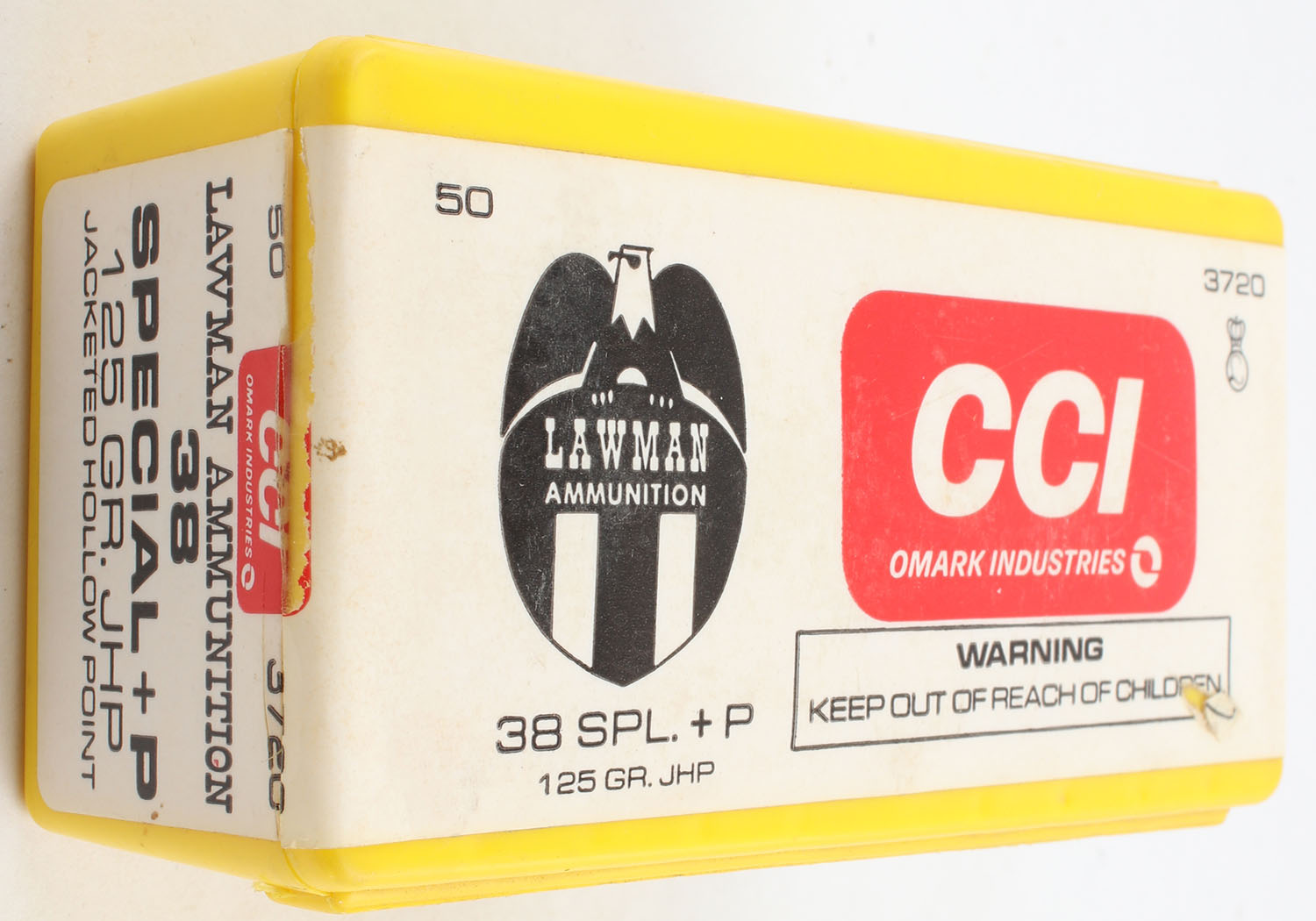 CCI, Lawman, .38 Special +P, 125 Grain JHP, Partial 45rds., 1pc. Yellow plastic box with multi-colored label, box is very solid, ammo is excellent. Grade: Excellent - Value: 10 to 40