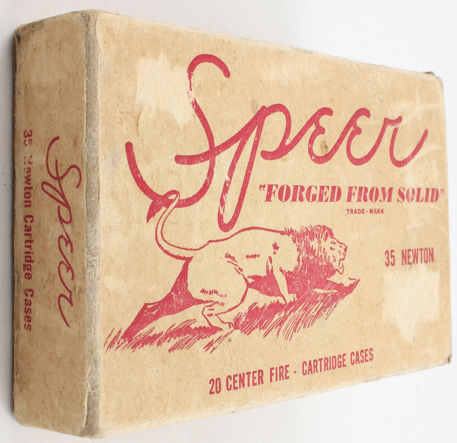 Speer, Center Fire Cartridges, .35 Newton, Full of Brass Only, 1pc. Buff box with red print, box has scuffing, edge & corner wear, end flaps are solid, brass is excellent. Grade: Very Good - Value: 20 to 60
