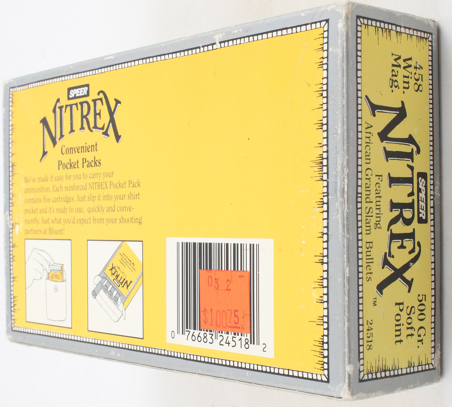 Speer, Nitrex, .458 Winchester Magnum, 500 Grain Soft Point, Full, 1pc. multi-colored box, box is very solid with excellent color, Ammo is excellent. Grade: Excellent ++ - Value: 40 to 80