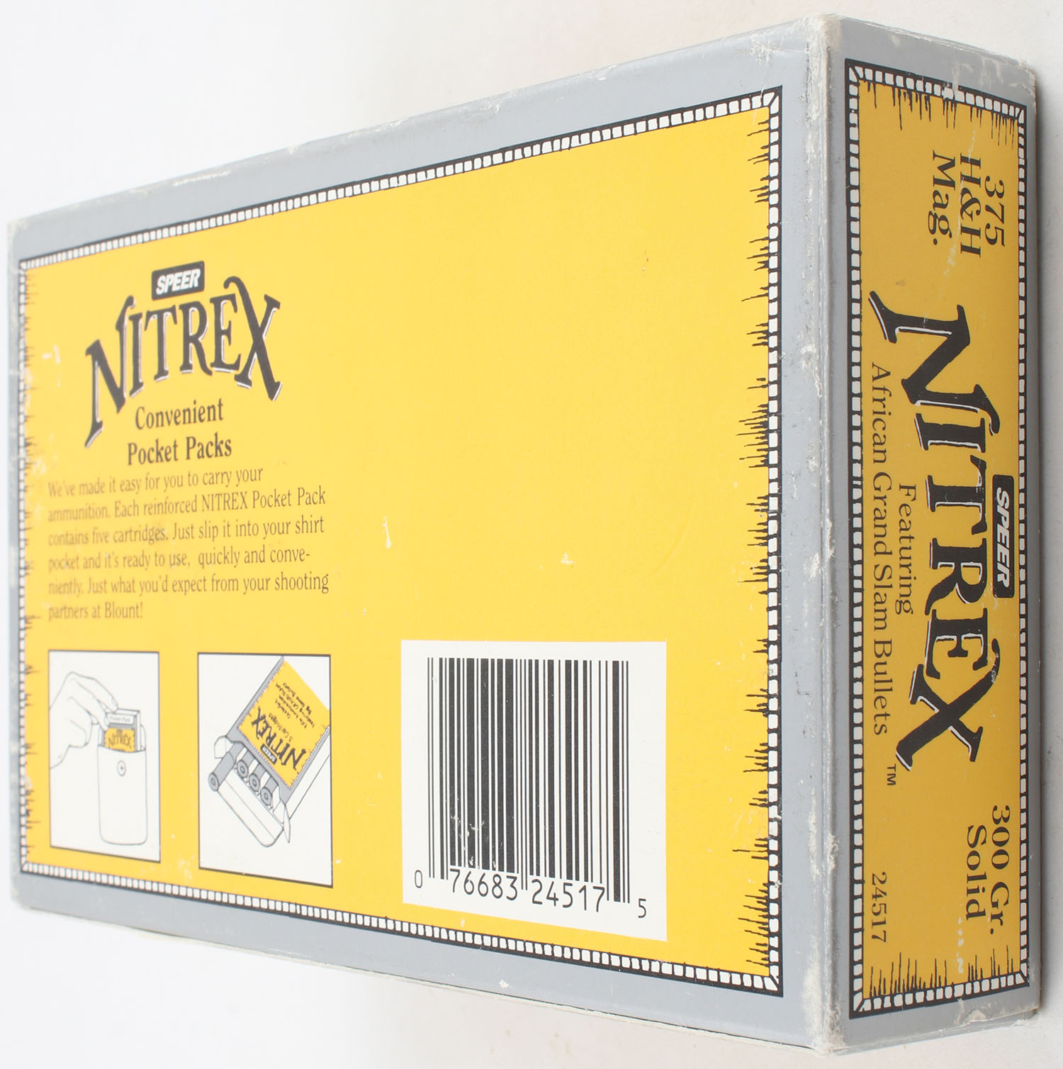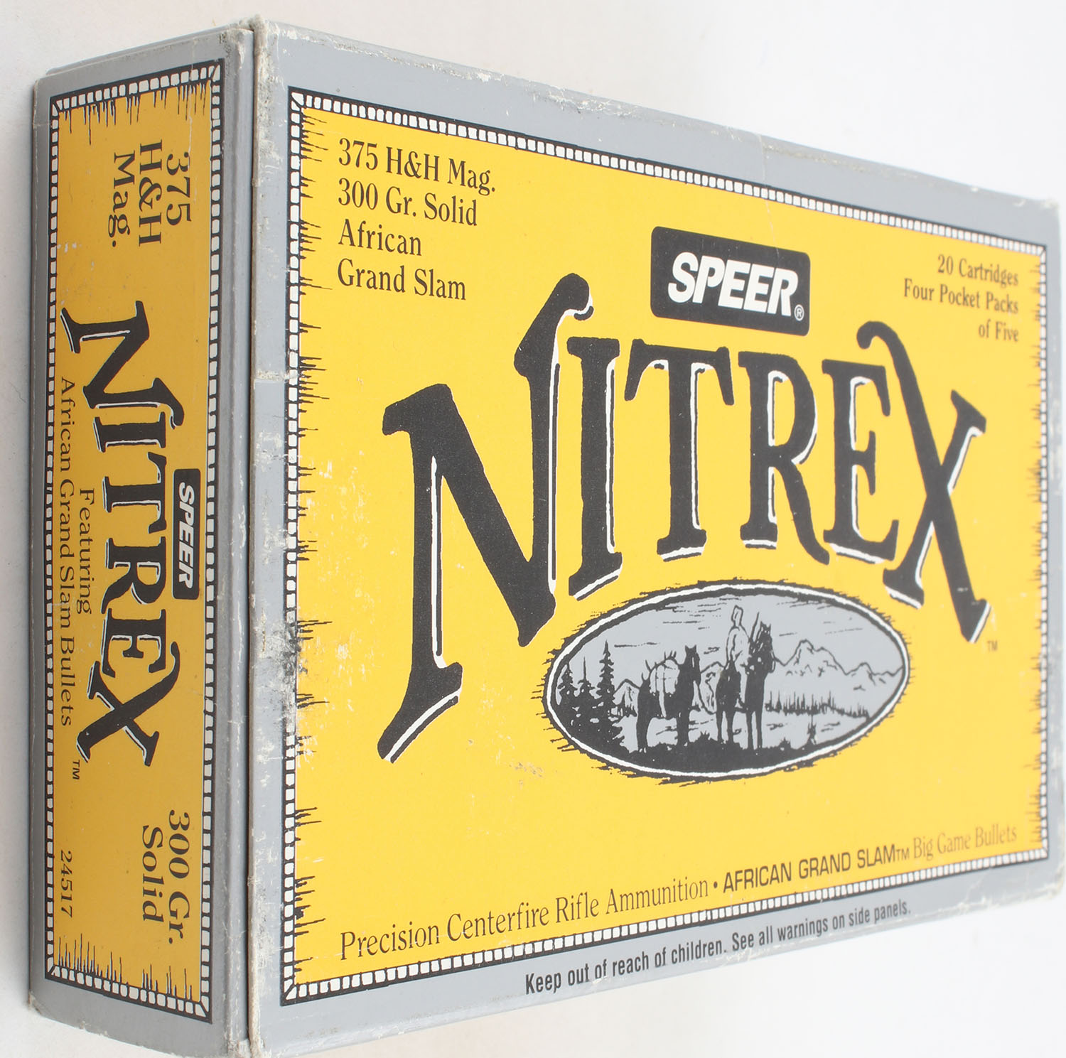 Speer, Nitrex, .375 H & H Magnum, 300 Grain, Full, 1pc. multi-colored box, box is very solid with excellent color, has edge wear, Ammo is excellent. Grade: Excellent - Value: 40 to 80