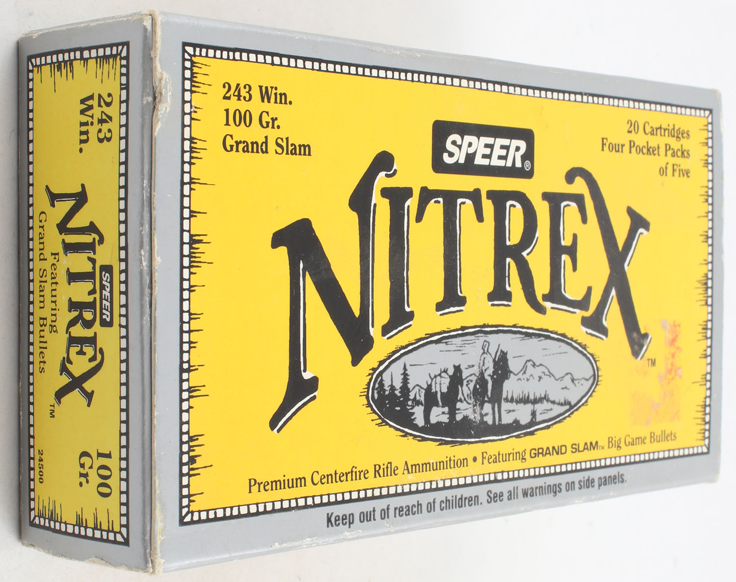 Speer, Nitrex, .243 Winchester, 100 Grain Grand Slam, Full, 1pc. Multi-colored box, box is very solid with excellent color, ammo is minty. Grade: Excellent + - Value: 20 to 60