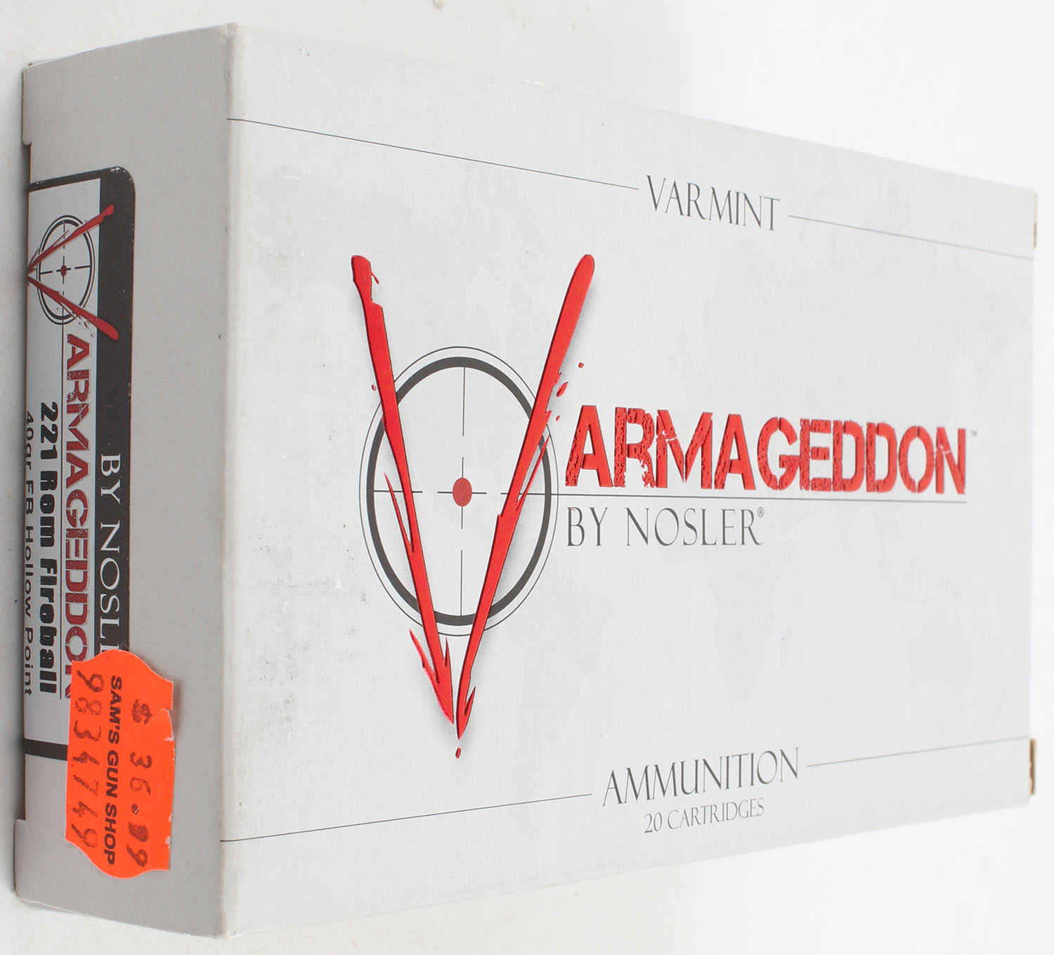 Nosler, Armageddon, .221 Remington Fireball, 40 Grain FB HP, Full, 1pc. multi-colored box, box is solid, Ammo is excellent. Grade: MINT - Value: 20 to 40