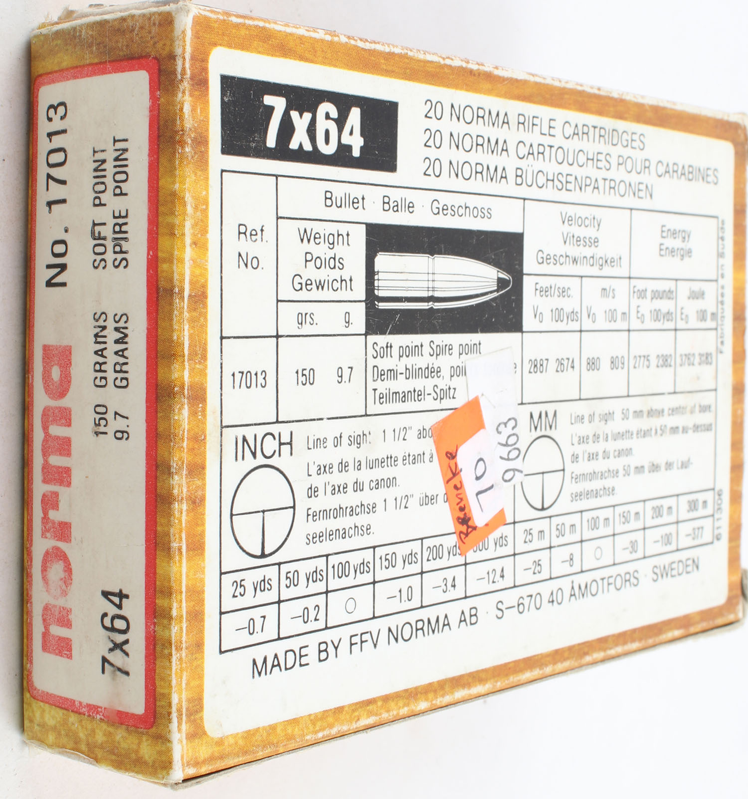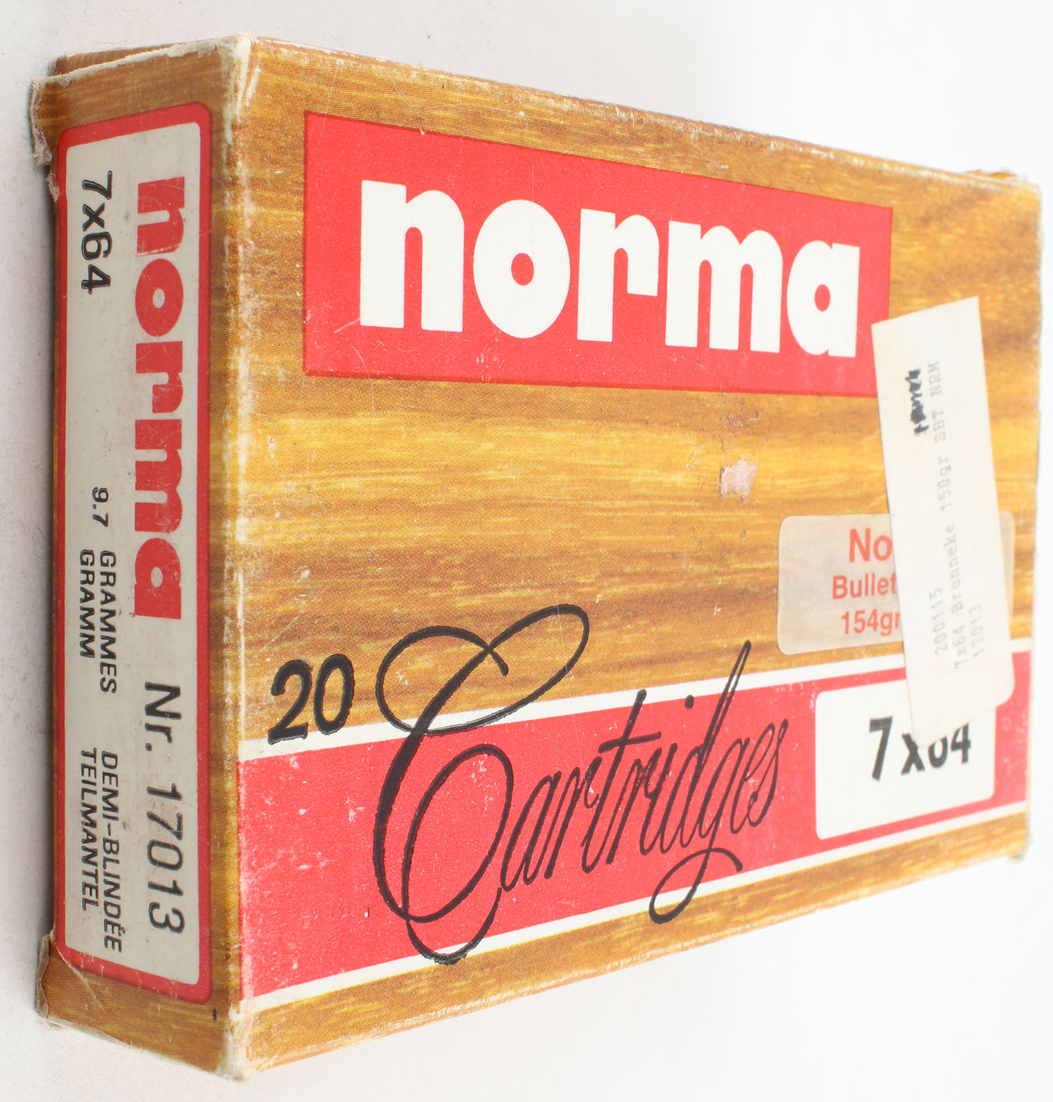 Norma, 7x64, 150 Grain Soft Point, Full, 1pc. multi-colored box, box is solid with excellent color, has shelf wear, light edge & corner wear, Ammo is excellent. Grade: Very Good - Value: 10 to 30