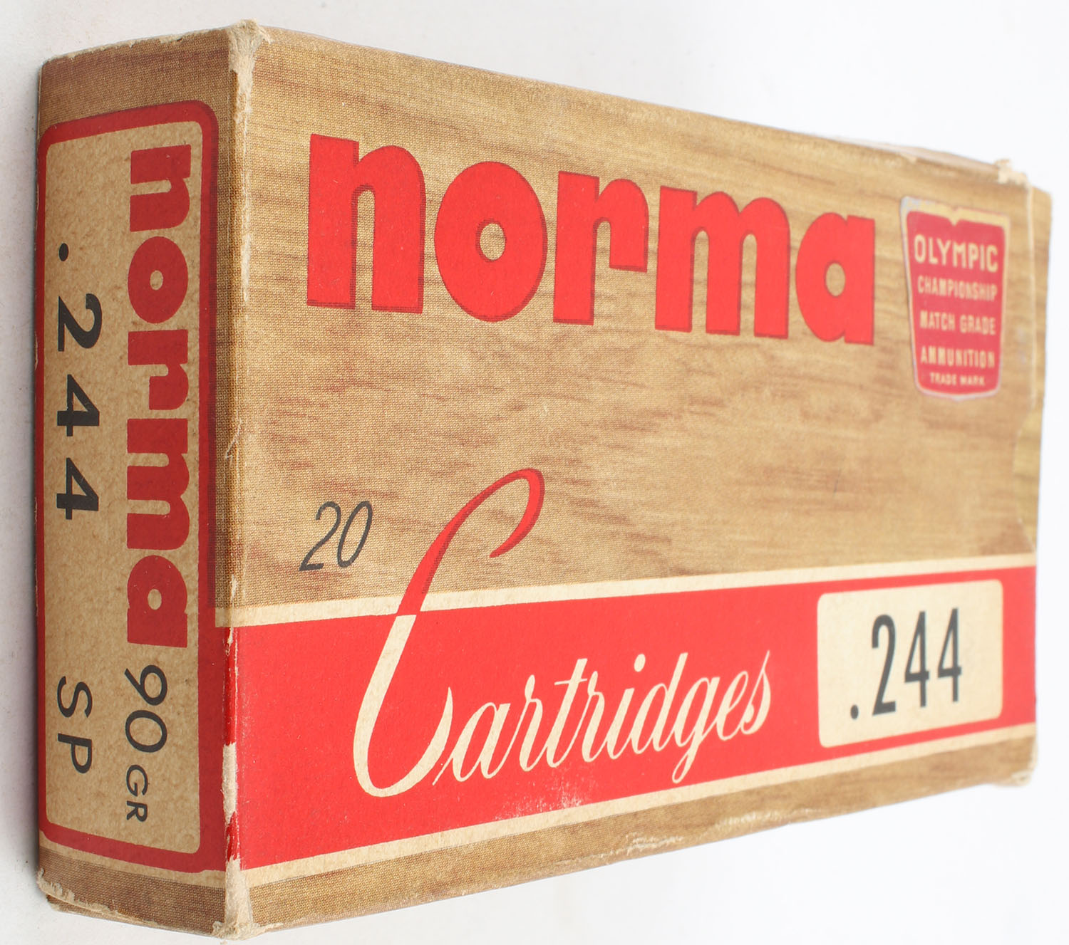 Norma, .244, Soft Point, 90 Grain, Full with 17rds. Being correct, 1pc. Multi-colored box, box is solid with very good color, has shelf wear, corner wear, ammo is very good. Grade: Good ++ - Value: 10 to 40