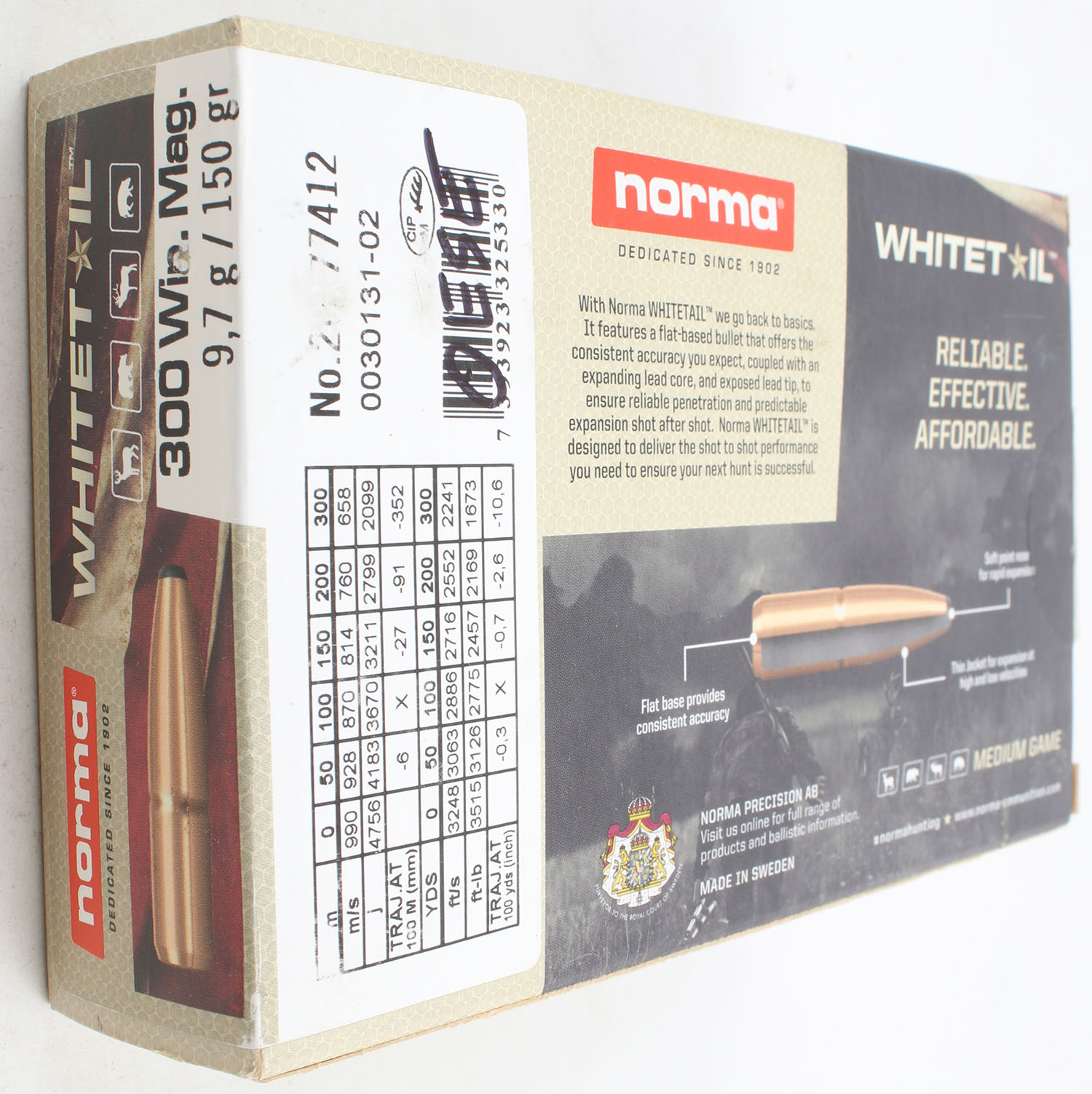 Norma, Whitetail, .300 Winchester Magnum, 150 Grain, Full & Sealed, 1pc. Multi-colored box, box is very solid with minty colors. Grade: MINT - Value: 20 to 40