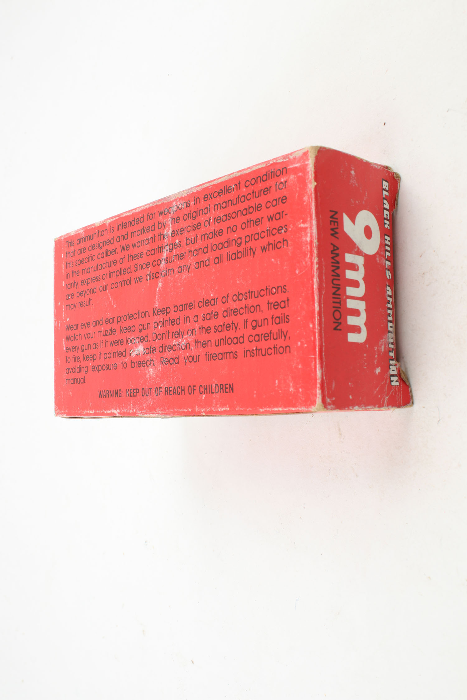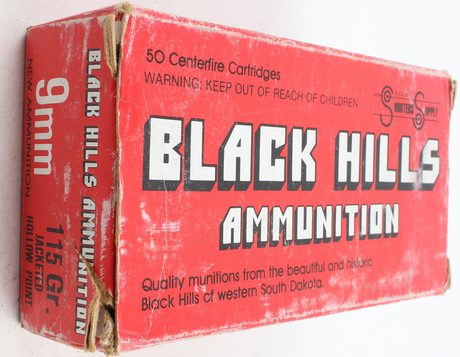 Black Hills, 9mm, 115 Grain Jacketed HP, Full, 1pc. Multi-colored box, box has light age soiling, scuffing, edge & corner wear, ammo is very good. Grade: Good ++ - Value: 10 to 30
