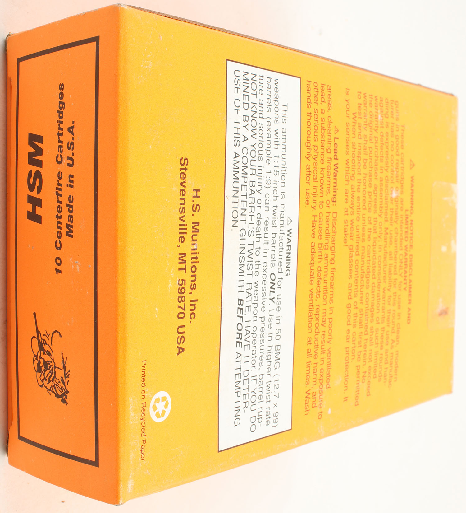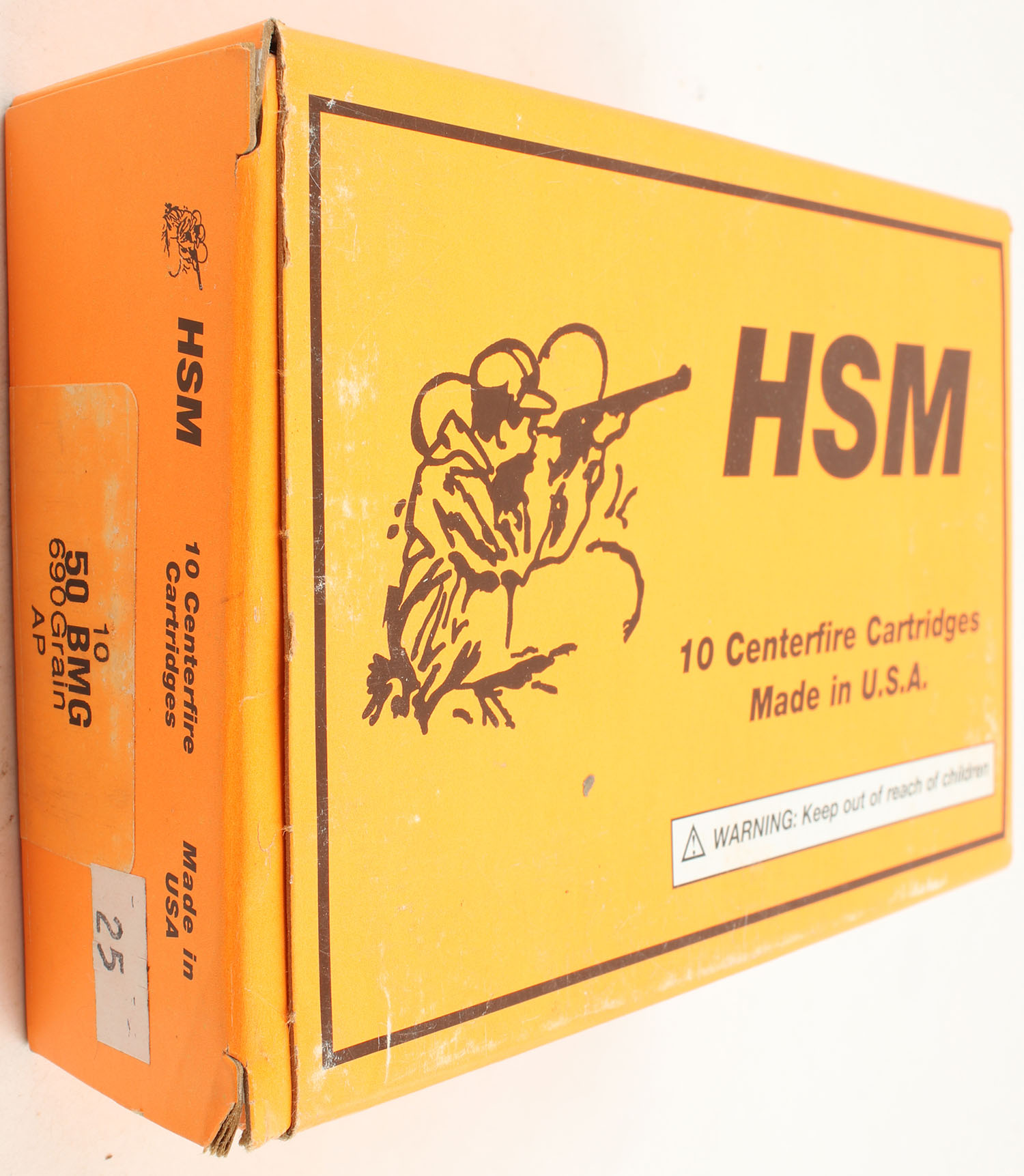 HSM, 50 BMG, 690 Grain AP, Full, 1pc., Orange and black box, box is very solid with excellent color, ammo is excellent. Grade: Excellent ++ - Value: 50 to 75
