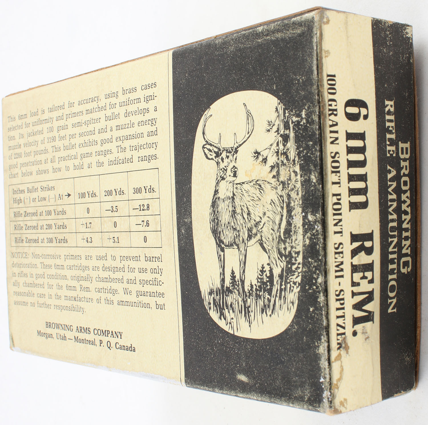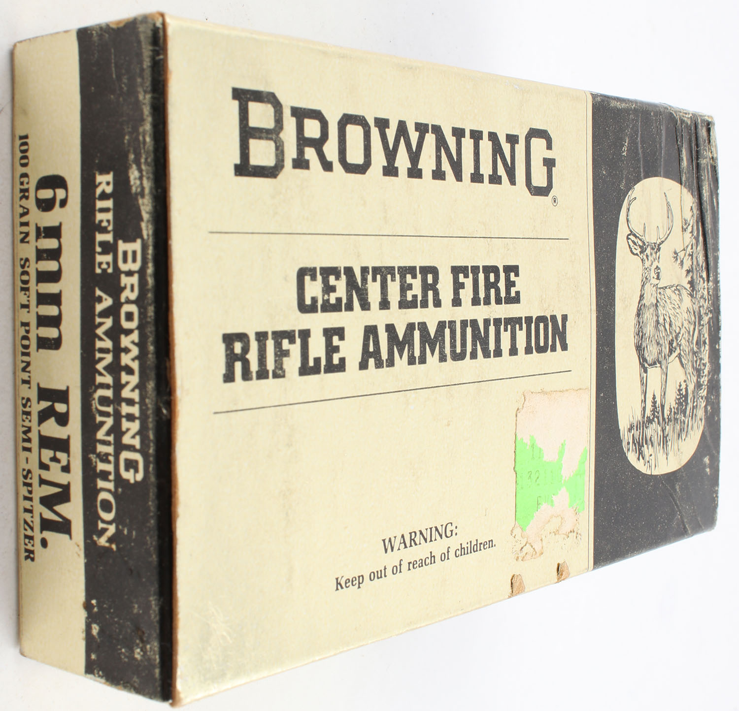 Browning, 6mm Rem., 100 Grain Soft Point Spitzer, Full, 1pc., multi-colored box, box has scuffing with rub marks, ammo is very good. Grade: Very Good - Value: 20 to 50