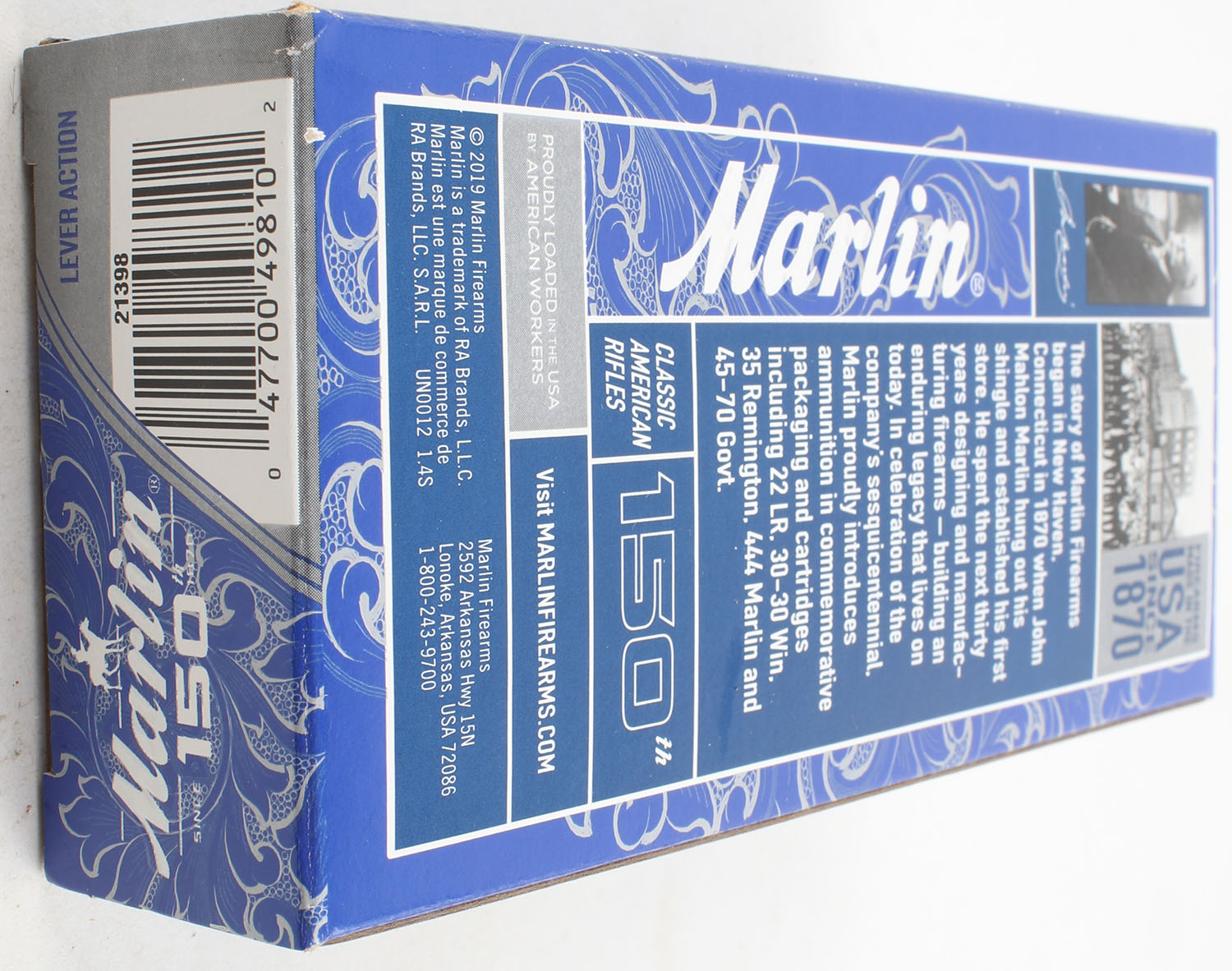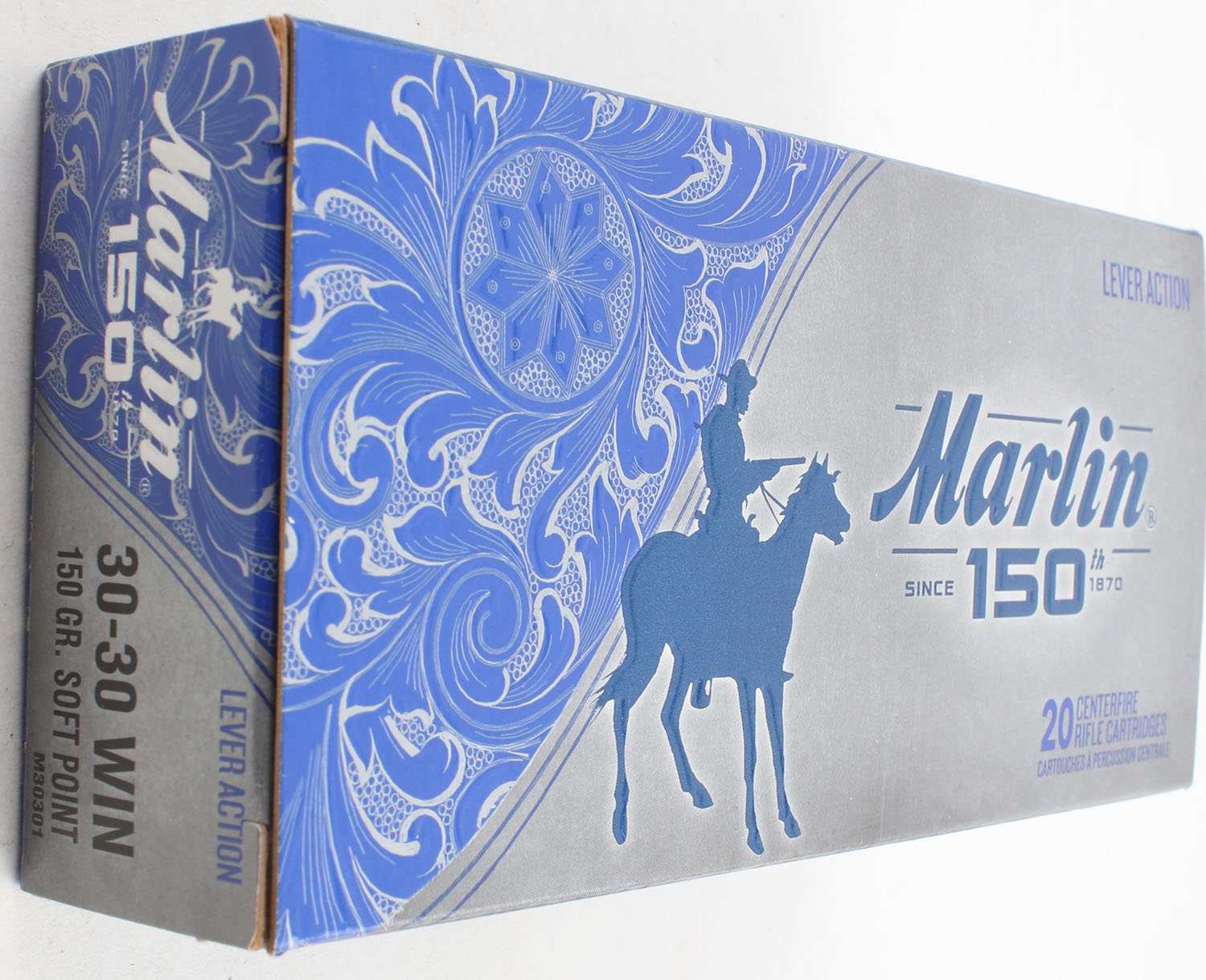 Marlin, Lever Action, .30-30 Winchester, 150 Grain Soft Point, Full, 1pc. Multi-colored box, box is very solid with excellent color, ammo is minty. Grade: MINT - Value: 40 to 100