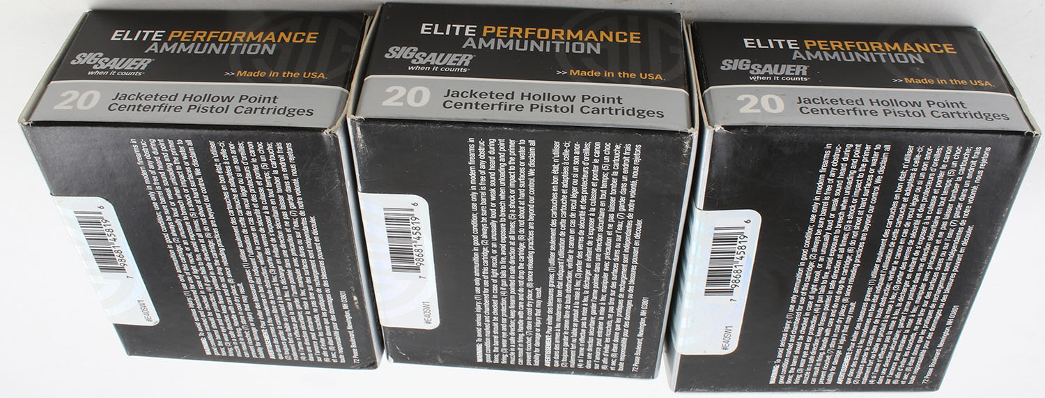 Sig Sauer, Lot of (3), Elite Performance, .40 Smith & Wesson, 165 Grain V-Crown JHP, Full, 1pc. Multi-colored box, box is very solid with excellent color, ammo is minty. Grade: Excellent + - Value: 40 to 60