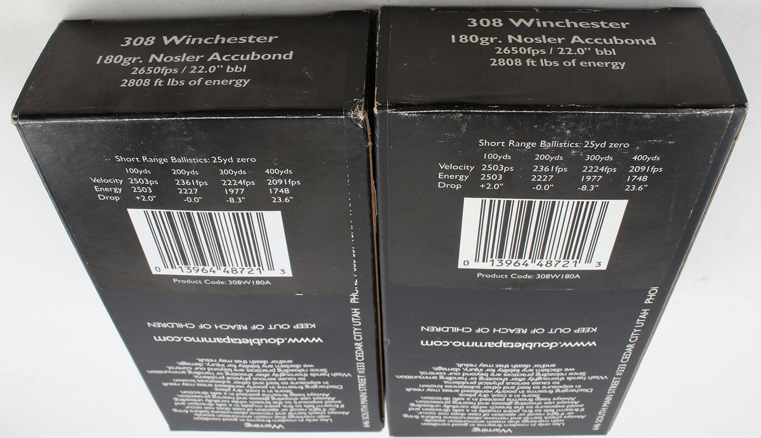 McNett's, Lot of (2), Double Tap Ammunition, .308 Winchester, 180 Grain Nosler Accubond, Full, 1pc. Multi-colored boxes, boxes are very solid, end flaps are solid, edges are crisp, ammo is very good. Grade: Excellent - Value: 30 to 60