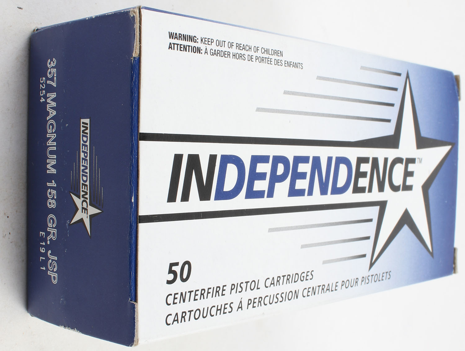 Independence, .357 Magnum, 158 Grain JSP, Full, 1pc. Multi-colored box, box is very solid with excellent color, ammo is excellent. Grade: Excellent - Value: 20 to 40