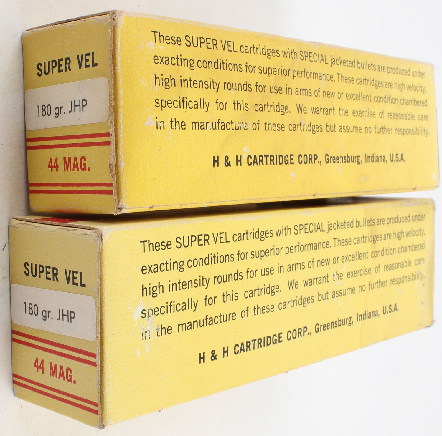 Super Vel, Lot of (2), .44 Mag., 180 Grain JHP, Full, 1pc. Yellow boxes with red & black print, boxes are very solid with excellent color, ammo is minty. Grade: Excellent + - Value: 40 to 80