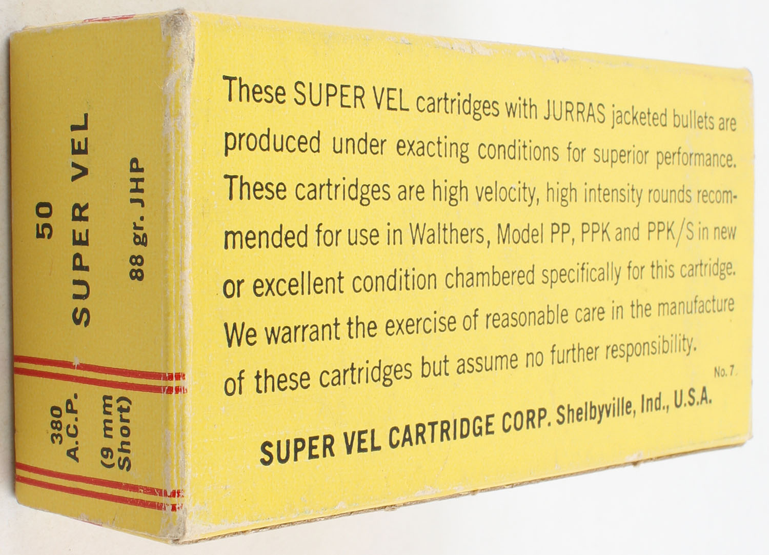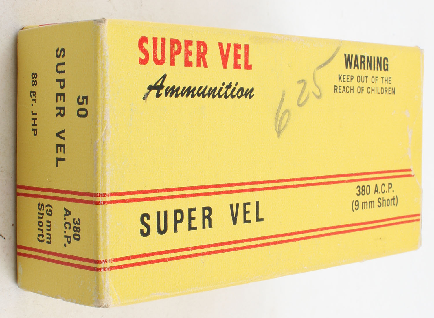 Super Vel, .380 ACP (9mm Short), 88 Grain JHP, Full, 1pc. Yellow box with red & black print, box is solid with very good color, ammo is excellent. Grade: Excellent - Value: 10 to 30
