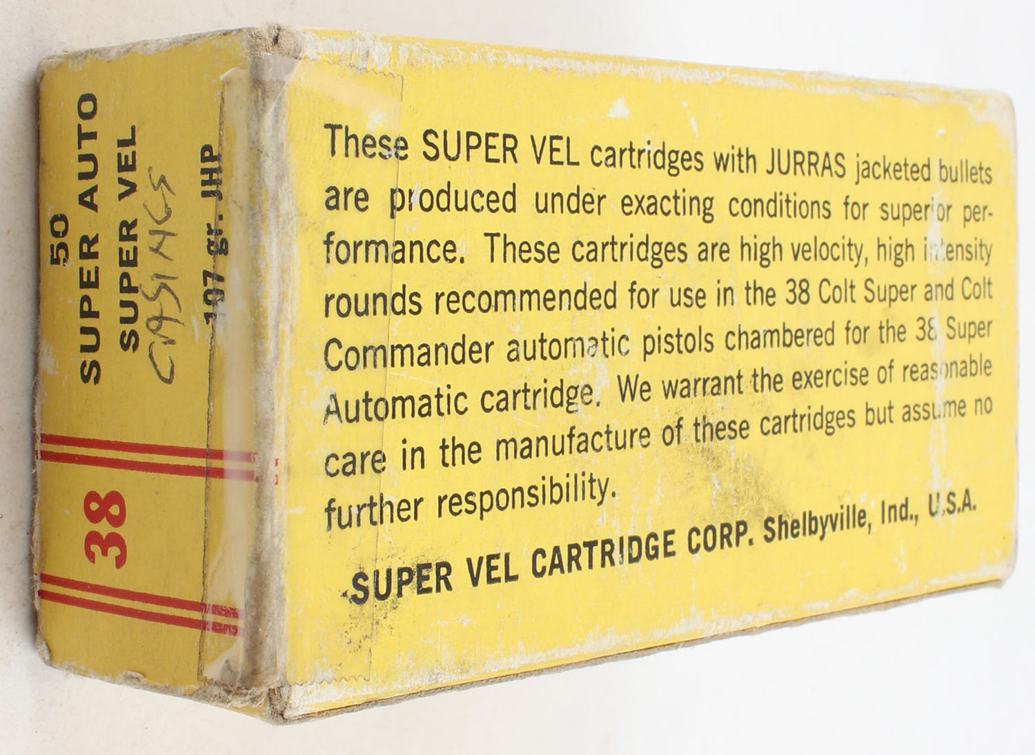 Super Vel, .38 Super Auto., 107 Grain JHP, Full, 1pc. Yellow box with red & black print, box has light age soiling, scuffing, edge & corner wear, ammo is excellent. Grade: Good ++ - Value: 10 to 40