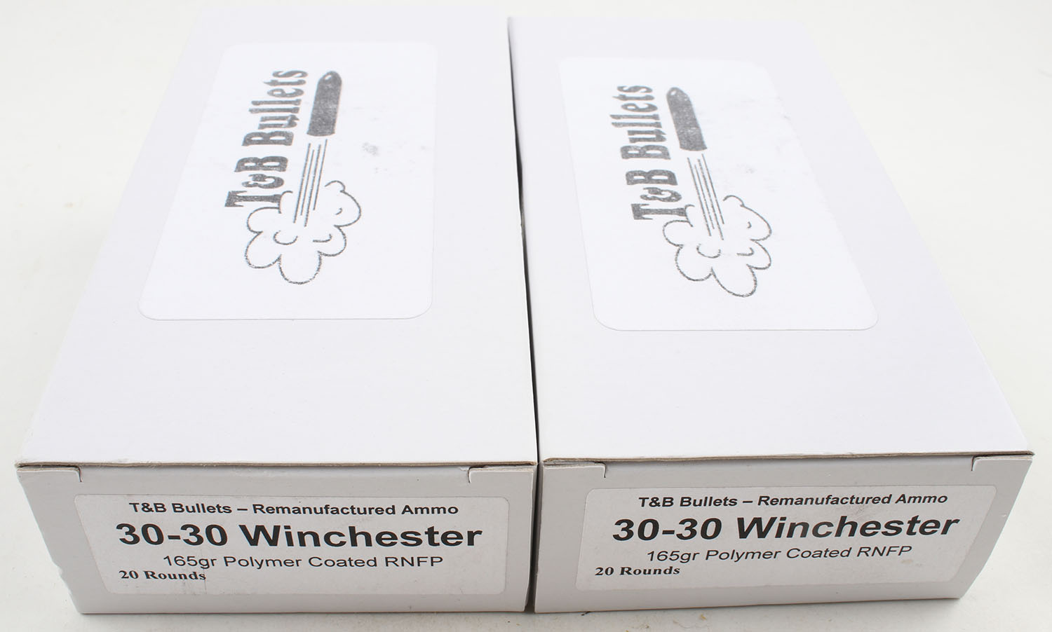 T&B Bullets, Lot of (2), .30-30 Winchester ammo boxes, Remanufactured Ammo by a class type 7 Ammo MFG (this is the same class (high quality) as Winchester, Federal and or CCI), 165 Grain Polymer Coated RNFP bullet, loaded cartridges, Full, 1pc, white boxes are very solid, ammo is minty. Grade: Excellent ++ - Value: 20 to 60