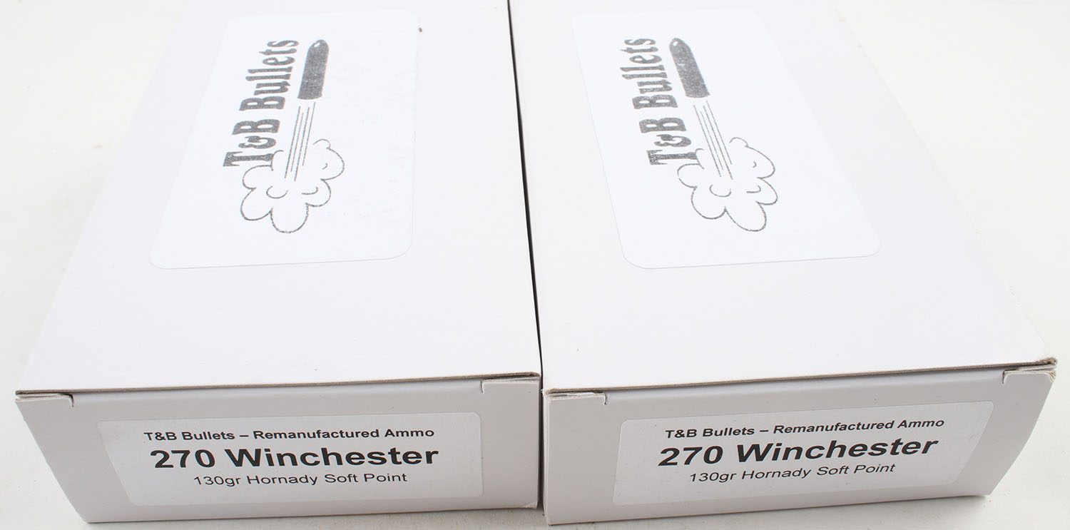 T&B Bullets, Lot of (2), .270 Winchester ammo boxes, Remanufactured Ammo by a class type 7 Ammo MFG (this is the same class (high quality) as Winchester, Federal and or CCI), 130 Grain Hornady soft point bullet, loaded cartridges, Full, 1pc, white boxes are very solid, ammo is minty. Grade: Excellent ++ - Value: 20 to 60