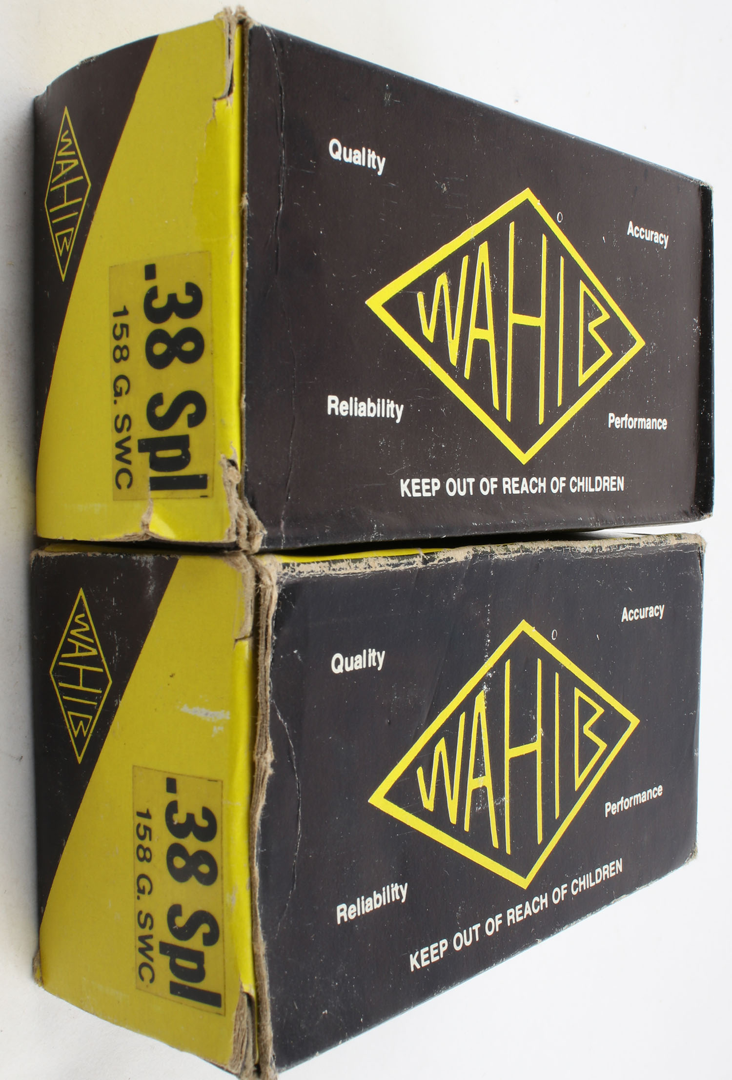 Wahib, Lot of (2), .38 Special, 158 Grain SWC., Full, 1pc., Black & yellow boxes, boxes have shelf wear, ammo is good. Grade: Very Good - Value: 20 to 30