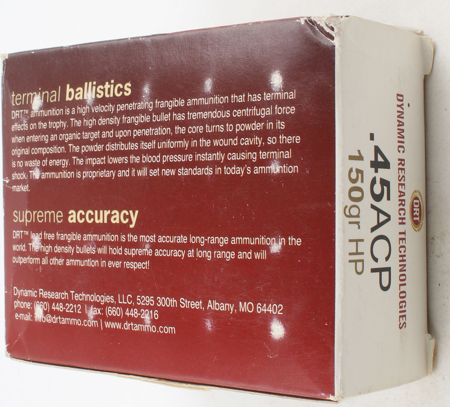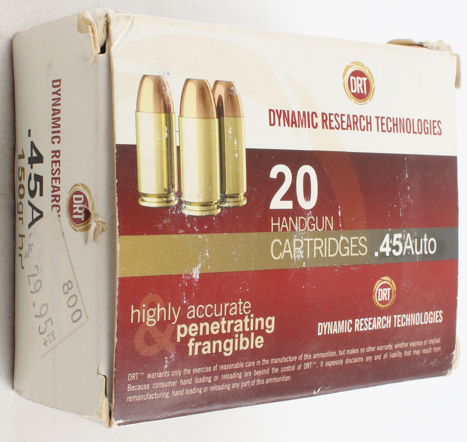 DRT, .45 ACP, 150 Grain Hollow Point, Full, 1pc. Multi-colored box, box is solid, ammo is minty. Grade: Excellent - Value: 10 to 30