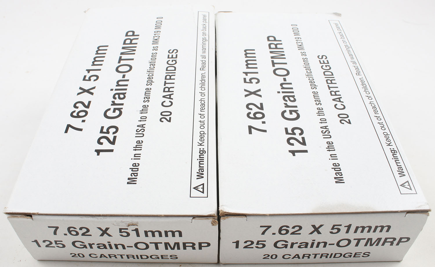 Unknown Mfg., Lot of (2) 7.62 x 51mm, 125 Grain OTMRP, Full, 1pc., white boxes with black print, boxes are very solid, ammo is very good. Grade: Excellent - Value: 20 to 30