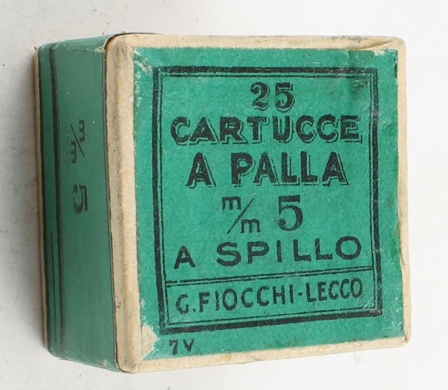 Fiocchi, Cartucce A Palla, 5mm Pinfire, FULL & SEALED, 2pc, buff box with green top & side sealing labels, box is solid with excellent color, very minor age soiling, corners are mostly sharp, edges are crisp, labels are intact. Grade: Excellent ++ - Value: 100 to 300