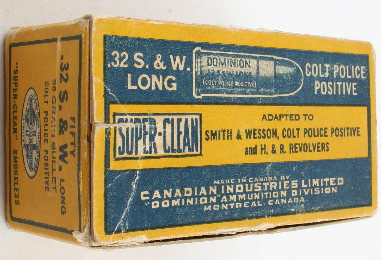 CIL, Super Clean, .32 Smith & Wesson Long, 98 Grain Bullet, Colt Police Positive, Partial 47rds., 1pc. Yellow & blue box, box is solid with very good color, has scuffing, edge & corner wear, ammo is excellent. Grade: Very Good ++ - Value: 20 to 60
