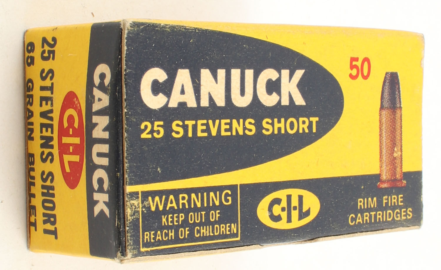 CIL, Canuck, 25 Stevens Short, 65 Grain, Full, 1pc. Multi-colored box, box is very solid with excellent color, Ammo is minty. Grade: Excellent + - Value: 40 to 120